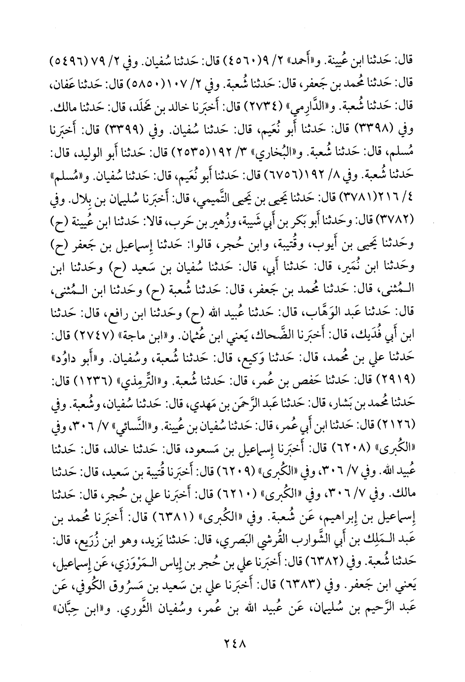 و «التِّرمِذي» (١٢٣٦) قال: حدثنا محمد بن بشار، قال: حدثنا عبد الرَّحمَن بن مهدي، قال: حدثنا سفيان، وشعبة. وفي (٢١٢٦) قال: حدثنا ابن أبي عمر، قال: حدثنا سفيان بن عُيينة. و «النَّسَائي» ٧/ ٣٠٦، وفي «الكبرى» (٦٢٠٨) قال: أخبرنا إسماعيل بن مسعود، قال: حدثنا خالد، قال: حدثنا عُبيد الله. وفي ٧/ ٣٠٦، وفي «الكبرى» (٦٢٠٩) قال: أخبرنا قتيبة بن سعيد، قال: حدثنا مالك. وفي ٧/ ٣٠٦، وفي «الكبرى» (٦٢١٠) قال: أخبرنا علي بن حُجْر، قال: حدثنا إسماعيل بن إبراهيم، عن شعبة. وفي «الكبرى» (٦٣٨١) قال: أخبرنا محمد بن عبد الملك بن أبي الشوارب القرشي البصري، قال: حدثنا يزيد، وهو ابن زُريع، قال: حدثنا شعبة. وفي (٦٣٨٢) قال: أخبرنا علي بن حُجْر بن إياس المَرْوَزي، عن إسماعيل، يعني ابن جعفر. وفي (٦٣٨٣) قال: أخبرنا علي بن سعيد بن مسروق الكوفي، عن عبد الرحيم بن سليمان، عن عُبيد الله بن عمر، وسفيان الثوري. و «ابن حِبَّان»