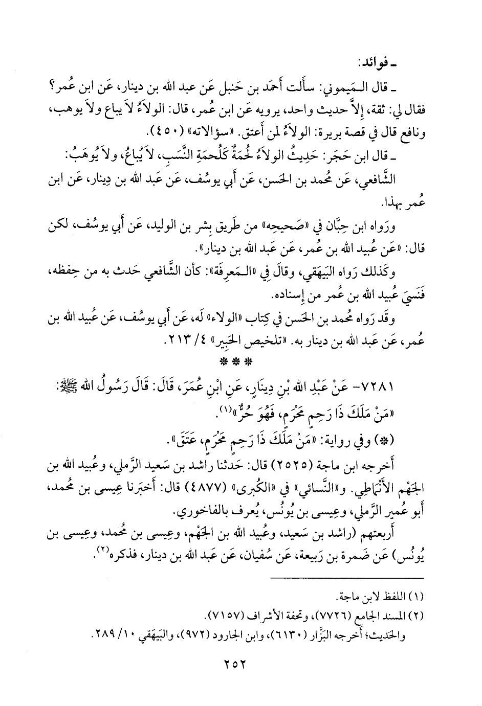 - وقال ابن حَجَر: حديث الولاءُ لُحمَة كَلُحمَة النَّسَب، لا يُباعُ، ولا يُوهَب: