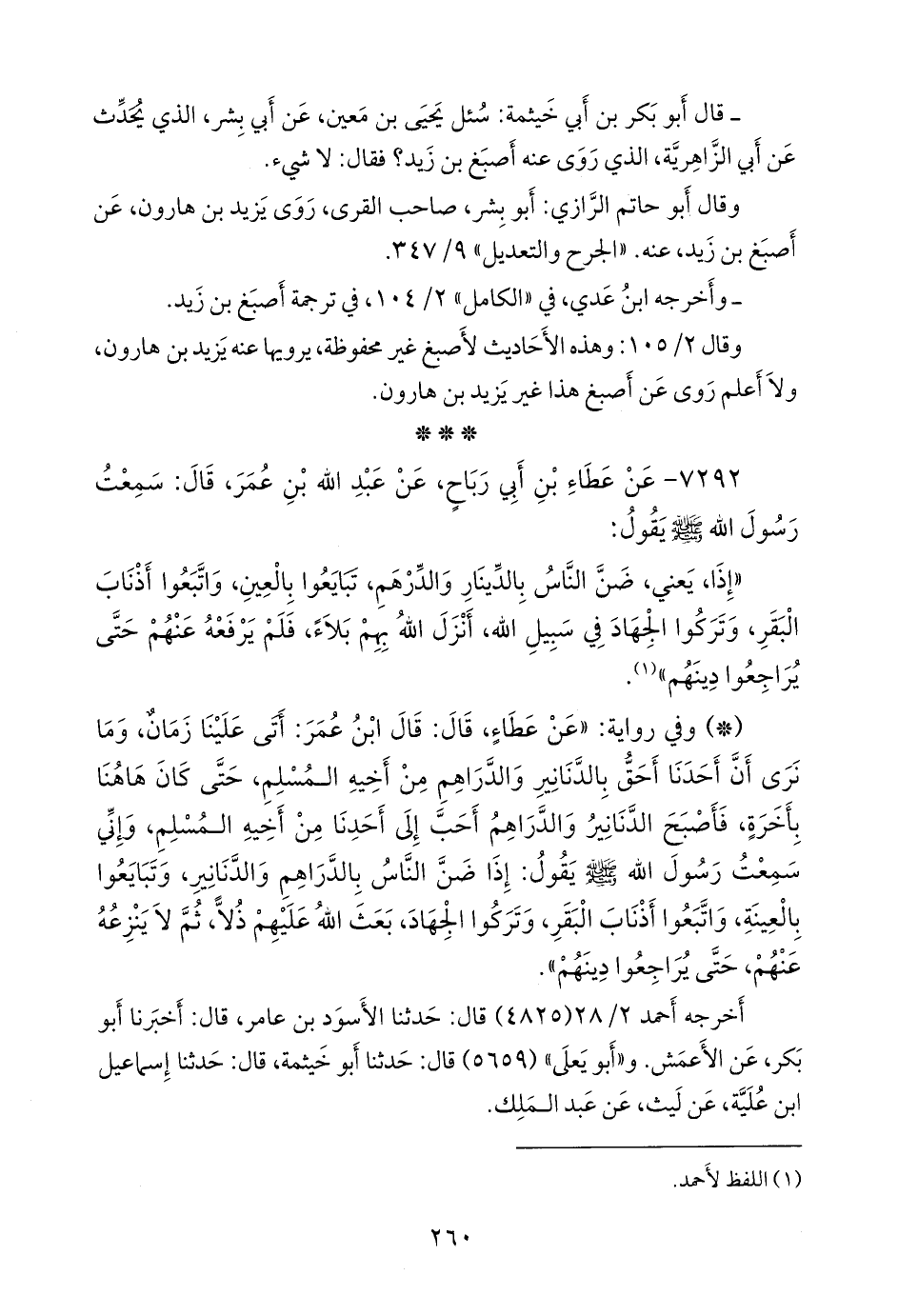 - وفي رواية: «عن عطاء، قال: قال ابن عمر: أتى علينا زمان، وما نرى أن أحدنا أحق بالدنانير والدراهم من أخيه المسلم، حتى كان هاهنا بأخرة، فأصبح الدنانير والدراهم أحب إلى أحدنا من أخيه المسلم، وإني سمعت رسول الله صَلى الله عَليه وسَلم يقول: إذا ضن الناس بالدراهم والدنانير، وتبايعوا بالعينة، واتبعوا أذناب البقر، وتركوا الجهاد، بعث الله عليهم ذلا، ثم لا ينزعه عنهم، حتى يراجعوا دينهم».