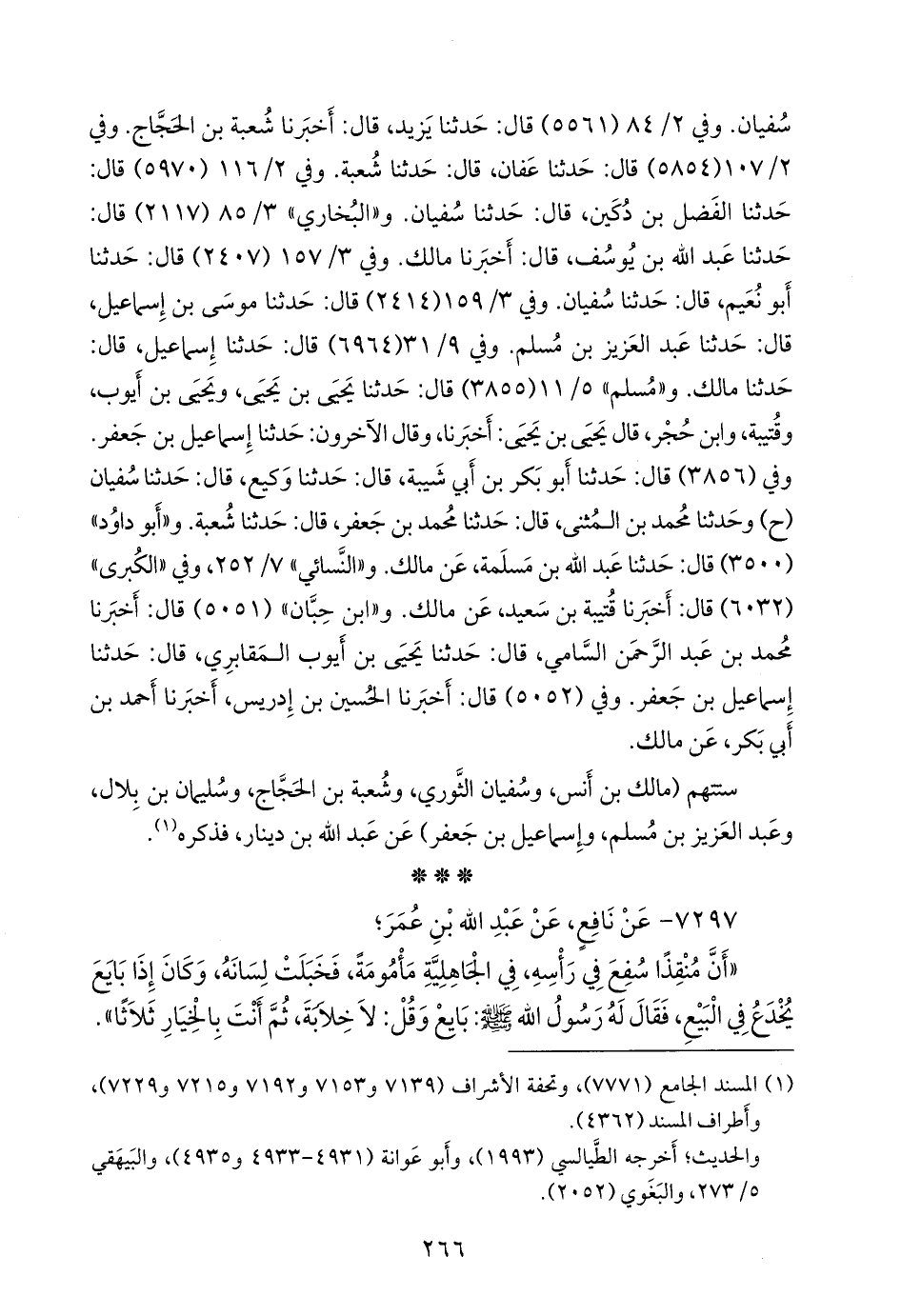 وفي ٢/ ٨٤ (٥٥٦١) قال: حدثنا يزيد، قال: أخبرنا شعبة بن الحجاج. وفي ٢/ ١٠٧ (٥٨٥٤) قال: حدثنا عفان، قال: حدثنا شعبة. وفي ٢/ ١١٦ (٥٩٧٠) قال: حدثنا الفضل بن دُكَين، قال: حدثنا سفيان. و «البخاري» ٣/ ٦٥ (٢١١٧) قال: حدثنا عبد الله بن يوسف، قال: أخبرنا مالك. وفي ٣/ ١٢٠ (٢٤٠٧) قال: حدثنا أَبو نُعيم، قال: حدثنا سفيان. وفي ٣/ ١٢١ (٢٤١٤) قال: حدثنا موسى بن إسماعيل، قال: حدثنا عبد العزيز بن مسلم. وفي ٩/ ٢٤ (٦٩٦٤) قال: حدثنا إسماعيل، قال: حدثنا مالك. و «مسلم» ٥/ ١١ (٣٨٥٥) قال: حدثنا يحيى بن يحيى، ويحيى بن أيوب، وقتيبة، وابن حجر، قال يحيى بن يحيى: أخبرنا، وقال الآخرون: حدثنا إسماعيل بن جعفر. وفي (٣٨٥٦) قال: حدثنا أَبو بكر بن أبي شيبة، قال: حدثنا وكيع، قال: حدثنا سفيان (ح) وحدثنا محمد بن المثنى، قال: حدثنا محمد بن جعفر، قال: حدثنا شعبة. و «أَبو داود» (٣٥٠٠) قال: حدثنا عبد الله بن مَسلَمة، عن مالك. و «النَّسَائي» ٧/ ٢٥٢، وفي «الكبرى» (٦٠٣٢) قال: أخبرنا قتيبة بن سعيد، عن مالك. و «ابن حِبَّان» (٥٠٥١) قال: أخبرنا محمد بن عبد الرَّحمَن السامي، قال: حدثنا يحيى بن أيوب المقابري، قال: حدثنا إسماعيل بن جعفر. وفي (٥٠٥٢) قال: أخبرنا الحسين بن إدريس، قال: أخبرنا أحمد بن أَبي بكر، عن مالك.
