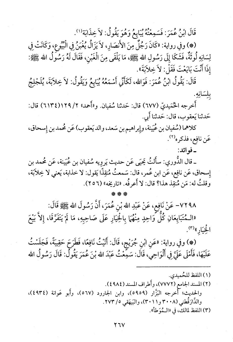 - وفي رواية: «عن ابن جُريج، قال: أتيت نافعا، فطرح حقيبة، فجلست عليها، فأملى علي في ألواحي، قال: سمعت عبد الله بن عمر يقول: قال رسول الله
