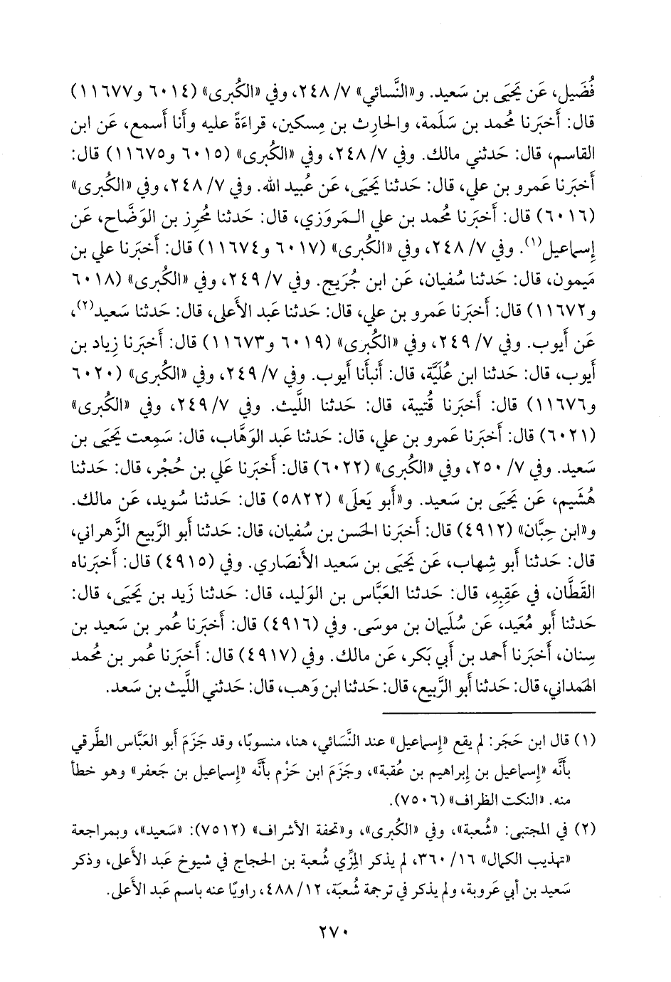 و «النَّسَائي» ٧/ ٢٤٨، وفي «الكبرى» (٦٠١٤ و ١١٦٧٧) قال: أخبرنا محمد بن سلمة، والحارث بن مسكين، قراءة عليه وأنا أسمع، عن ابن القاسم، قال: حدثني مالك. وفي ٧/ ٢٤٨، وفي «الكبرى» (٦٠١٥ و ١١٦٧٥) قال: أخبرنا عَمرو بن علي، قال: حدثنا يحيى، عن عُبيد الله. وفي ٧/ ٢٤٨، وفي «الكبرى» (٦٠١٦) قال: أخبرنا محمد بن علي المَرْوَزي، قال: حدثنا مُحرِز بن الوضاح، عن إسماعيل (¬١). وفي ٧/ ٢٤٨، وفي «الكبرى» (٦٠١٧ و ١١٦٧٤) قال: أخبرنا علي بن ميمون، قال: حدثنا سفيان، عن ابن جُريج. وفي ٧/ ٢٤٩، وفي «الكبرى» (٦٠١٨ و ١١٦٧٢) قال: أخبرنا عَمرو بن علي، قال: حدثنا عبد الأعلى، قال: حدثنا سعيد (¬٢)، عن أيوب. وفي ٧/ ٢٤٩، وفي «الكبرى» (٦٠١٩ و ١١٦٧٣) قال: أخبرنا زياد بن أيوب، قال: حدثنا ابن عُلَية، قال: أنبأنا أيوب. وفي ٧/ ٢٤٩، وفي «الكبرى» (٦٠٢٠ و ١١٦٧٦) قال: أخبرنا قتيبة، قال: حدثنا الليث. وفي ٧/ ٢٤٩، وفي «الكبرى» (٦٠٢١) قال: أخبرنا عَمرو بن علي، قال: حدثنا عبد الوَهَّاب، قال: سمعت يحيى بن سعيد. وفي ٧/ ٢٥٠، وفي «الكبرى» (٦٠٢٢) قال: أخبرنا علي بن حُجْر، قال: حدثنا هُشيم، عن يحيى بن سعيد. و «أَبو يَعلى» (٥٨٢٢) قال: حدثنا سويد، عن مالك.