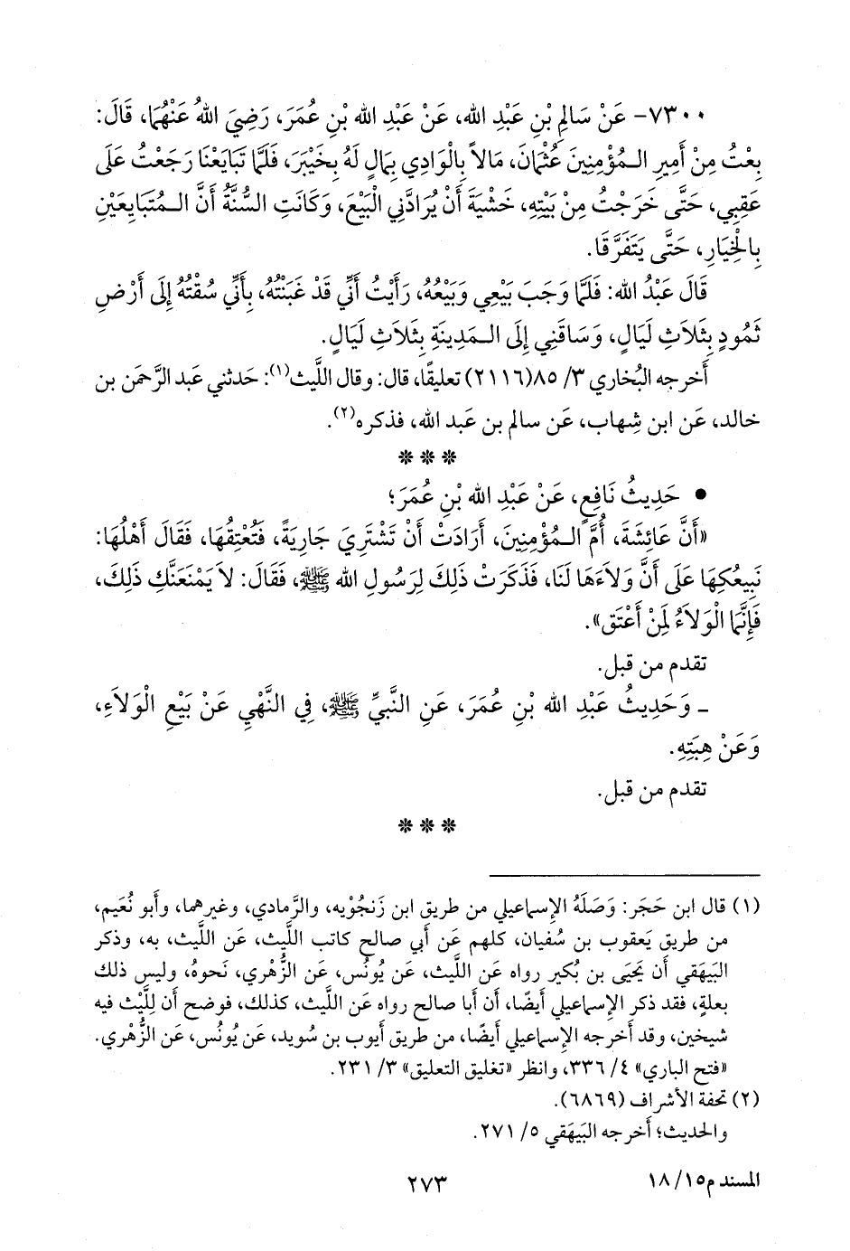 ٧٣٠٠ - عن سالم بن عبد الله، عن عبد الله بن عمر، رضي الله عنهما، قال: بعت من أمير المؤمنين عثمان، مالا بالوادي بمال له بخيبر، فلما تبايعنا رجعت على عقبي، حتى خرجت من بيته، خشية أن يرادني البيع، وكانت السنة أن المتبايعين بالخيار، حتى يتفرقا.