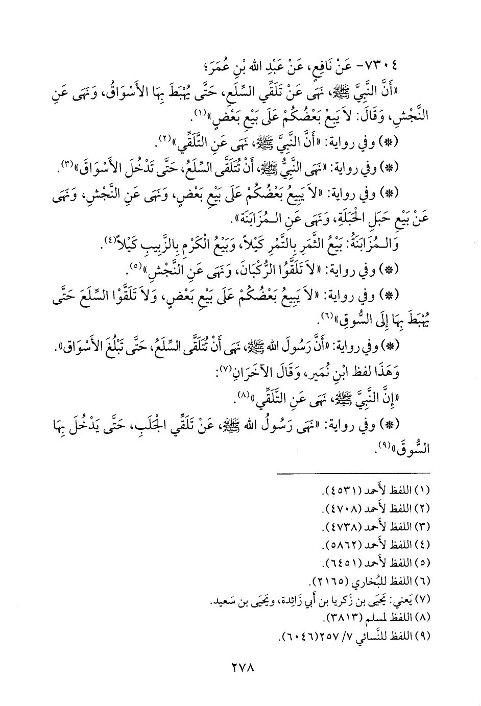 - وفي رواية: «نهى رسول الله صَلى الله عَليه وسَلم عن تلقي الجلب، حتى يدخل بها السوق» (¬٩).