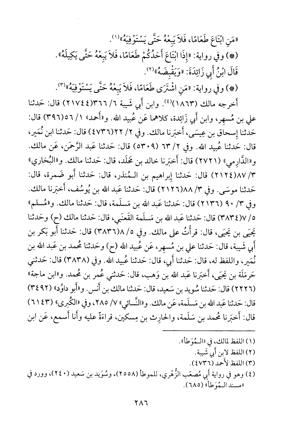وفي ٢/ ٢٢ (٤٧٣٦) قال: حدثنا ابن نُمير، قال: حدثنا عُبيد الله. وفي ٢/ ٦٣ (٥٣٠٩) قال: حدثنا عبد الرَّحمَن، عن مالك. و «الدَّارِمي» (٢٧٢١) قال: أخبرنا خالد بن مخلد، قال: حدثنا مالك. و «البخاري» ٣/ ٦٦ (٢١٢٤) قال: حدثنا إبراهيم بن المنذر، قال: حدثنا أَبو ضمرة، قال: حدثنا موسى. وفي ٣/ ٦٧ (٢١٢٦) قال: حدثنا عبد الله بن يوسف، قال: أخبرنا مالك. وفي ٣/ ٦٨ (٢١٣٦) قال: حدثنا عبد الله بن مَسلَمة، قال: حدثنا مالك. و «مسلم» ٥/ ٧ (٣٨٣٤) قال: حدثنا عبد الله بن مَسلَمة القَعنَبي، قال: حدثنا مالك (ح) وحدثنا يحيى بن يحيى، قال: قرأت على مالك. وفي ٥/ ٨ (٣٨٣٦) قال: حدثنا أَبو بكر بن أبي شيبة، قال: حدثنا علي بن مُسهِر، عن عُبيد الله (ح) وحدثنا محمد بن عبد الله بن نُمير، واللفظ له، قال: حدثنا أبي، قال: حدثنا عُبيد الله. وفي (٣٨٣٨) قال: حدثني حَرملة بن يحيى، قال: أخبرنا عبد الله بن وهب، قال: حدثني عمر بن محمد. و «ابن ماجة» (٢٢٢٦) قال: حدثنا سويد بن سعيد، قال: حدثنا مالك بن أنس. و «أَبو داود» (٣٤٩٢) قال: حدثنا عبد الله بن مَسلَمة، عن مالك. و «النَّسَائي» ٧/ ٢٨٥، وفي «الكبرى» (٦١٤٣) قال: أخبرنا محمد بن سلمة، والحارث بن مسكين، قراءة عليه وأنا أسمع، عن ابن