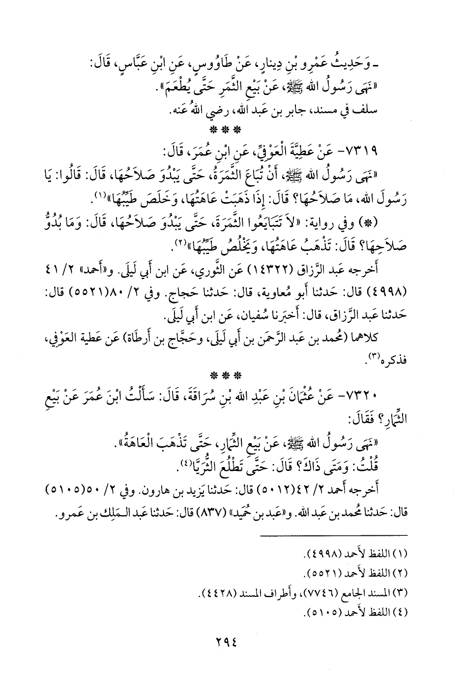 ٧٣٢٠ - عن عثمان بن عبد الله بن سراقة، قال: سألت ابن عمر عن بيع الثمار؟ فقال: