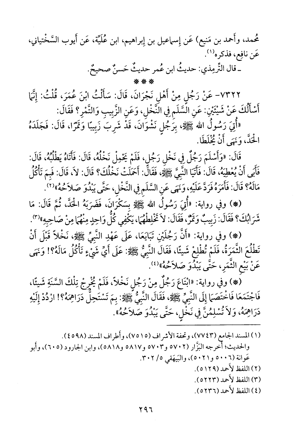 - وفي رواية: «ابتاع رجل من رجل نخلا، فلم يخرج تلك السنة شيئا، فاجتمعا فاختصما إلى النبي صَلى الله عَليه وسَلم فقال النبي صَلى الله عَليه وسَلم: بم تستحل دراهمه؟! اردد إليه دراهمه، ولا تسلمن في نخل، حتى يبدو صلاحه».
