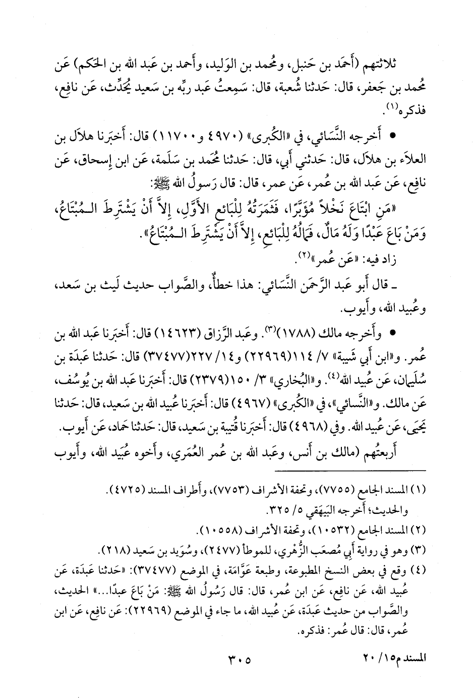 (¬٤) وقع في طبعات دار القبلة والرشد والفاروق وإشبيليا في الموضع (٣٧٤٧٧): «حدثنا عَبدة، عن عُبيد الله، عن نافع، عن ابن عمر، قال: قال رسول الله صَلى الله عَليه وسَلم: من باع عبدا» الحديث، والصواب من حديث عَبدة، عن عُبيد الله، ما جاء في الموضع (٢٢٩٦٩): عن نافع، عن ابن عمر، قال: قال عمر: فذكره.