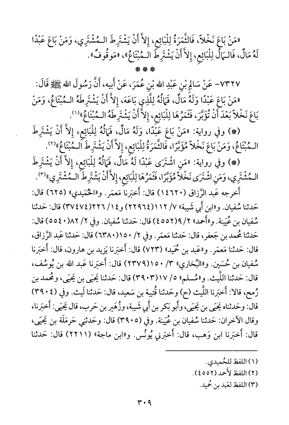 - وفي رواية: «من اشترى عبدًا له مال، فماله للبائع، إلا أن يشترط المشتري، ومن اشترى نخلا مؤبرا، فثمرها للبائع، إلا أن يشترط المشتري» (¬٣).