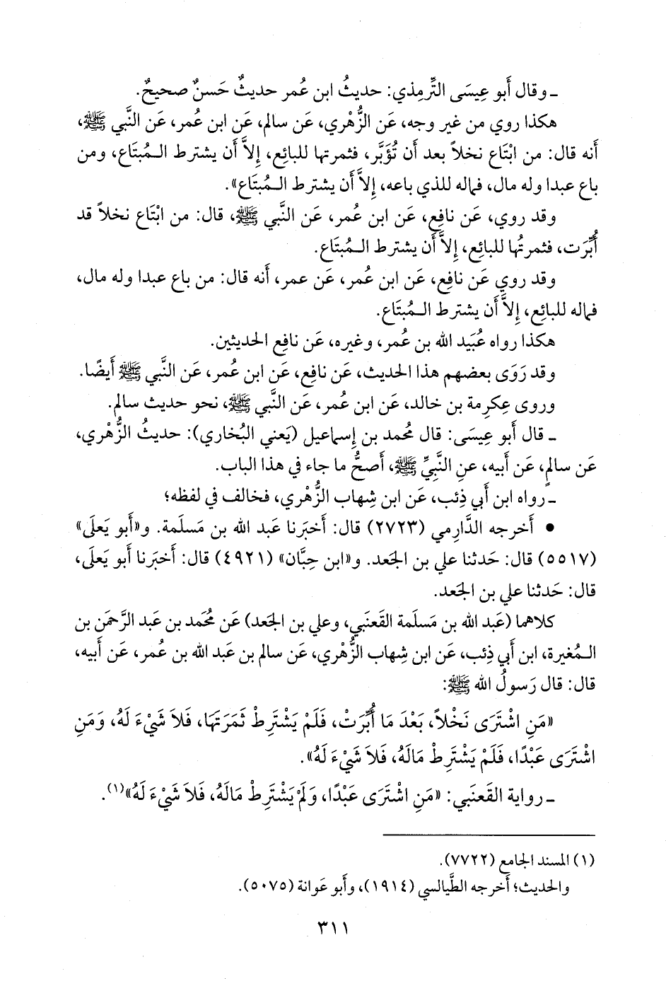 هكذا رُوي من غير وجه، عن الزُّهْري، عن سالم، عن ابن عمر، عن النبي صَلى الله عَليه وسَلم، قال: من ابتاع نخلًا بعد أَن تُؤَبَّر، فثمرتُها للبائع، إِلا أَن يشترط المُبتاع، ومن باع عبدًا وله مال، فماله للبائع إِلا أَن يشترط المُبتاع.
