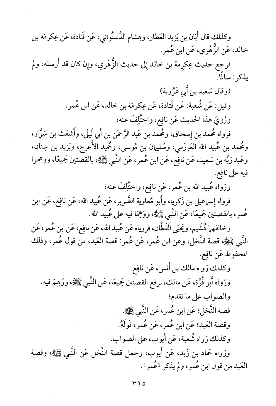 وخالفهما هُشيم، ويحيى القطان، فروياه عن عُبيد الله، عن نافع، عن ابن عمر، عن النبي صَلى الله عَليه وسَلم قصة النخل، وعن ابن عمر، عن عمر: قصة العبد، من قول عمر، وذلك المحفوظ عن نافع.