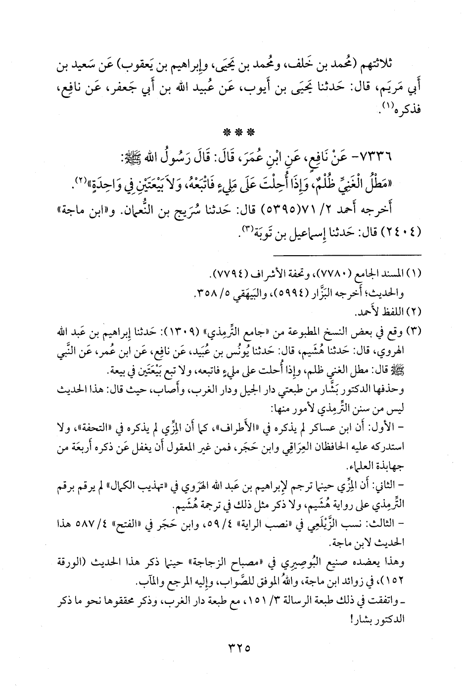 (¬٢) ورد في طبعة دار الصديق لـ «سنن التِّرمِذي» (١٣٠٩): حدثنا إِبراهيم بن عبد الله الهروي، قال: حدثنا هُشيم، قال: حدثنا يُونس بن عُبيد، عن نافع، عن ابن عمر، عن النبي صَلى الله عَليه وسَلم قال: «مَطل الغني ظلمٌ، وإِذا أُحِلت على مليءٍ فاتْبَعْه، ولا تَبع بَيعَتَين في بيعة، وهذا الحديث لم يرد في «تحفة الأشراف»، ولم يستدركه عليه ابن حَجَر في «النكت الظراف»، ولم يرد في طبعات الرسالة ودار الغرب والتأصيل.