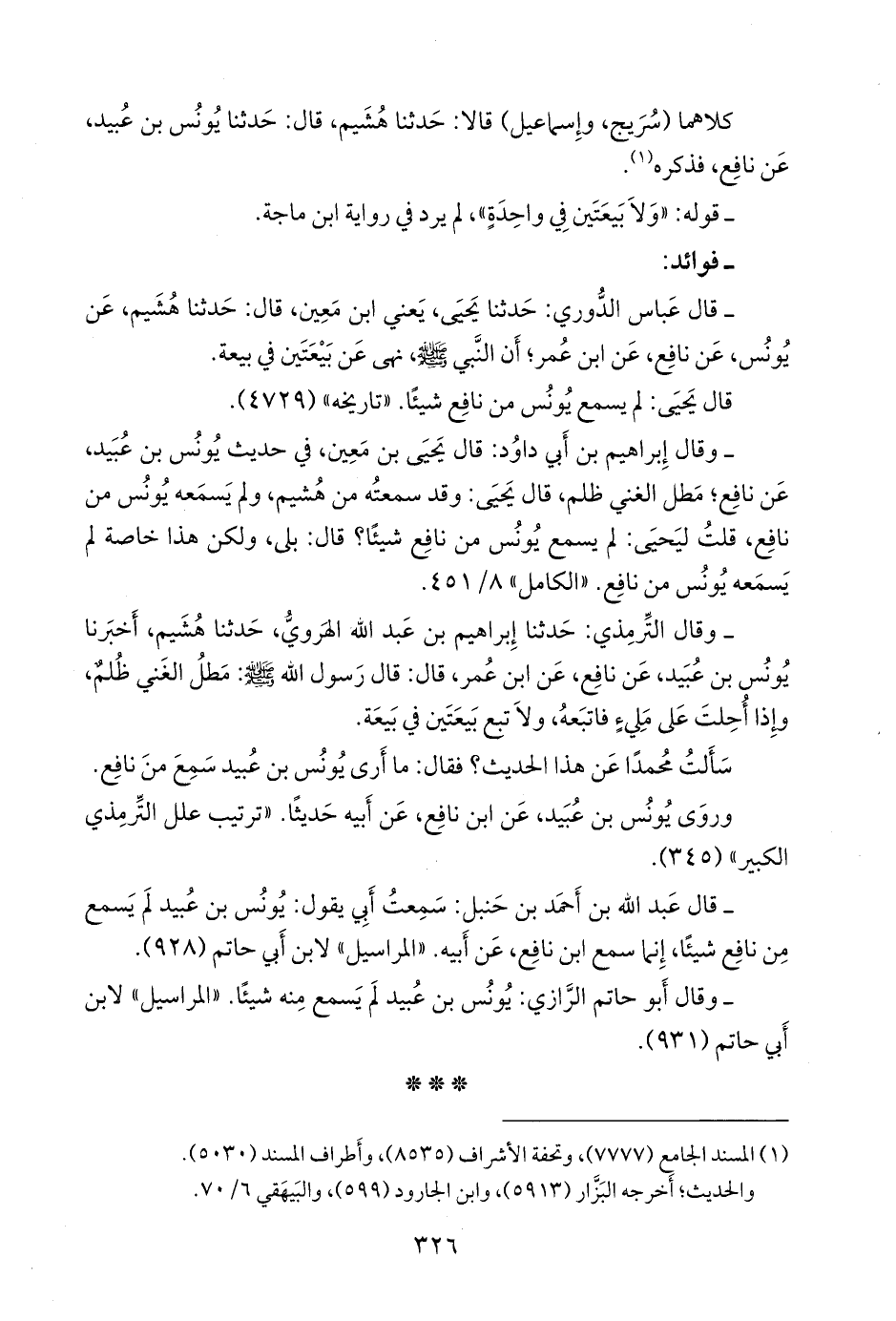 - قال عباس الدوري: حدثنا يحيى، يعني ابن مَعين، قال: حدثنا هُشيم، عن يونس، عن نافع، عن ابن عمر؛ أن النبي صَلى الله عَليه وسَلم نهى عن بيعتين في بيعة.