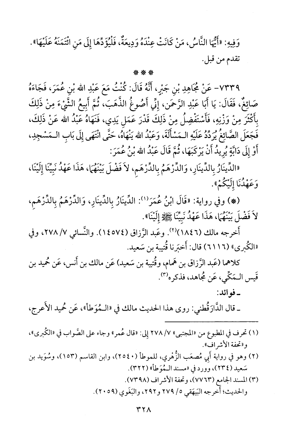 ٧٣٣٩ - عن مجاهد بن جبر، أنه قال: كنت مع عبد الله بن عمر، فجاءه صائغ، فقال: يا أبا عبد الرَّحمَن، إني أصوغ الذهب، ثم أبيع الشيء من ذلك بأكثر من وزنه، فأستفضل من ذلك قدر عمل يدي، فنهاه عبد الله عن ذلك، فجعل الصائغ يردد عليه المسألة، وعبد الله ينهاه، حتى انتهى إلى باب المسجد، أو إلى دابة يريد أن يركبها، ثم قال عبد الله بن عمر: