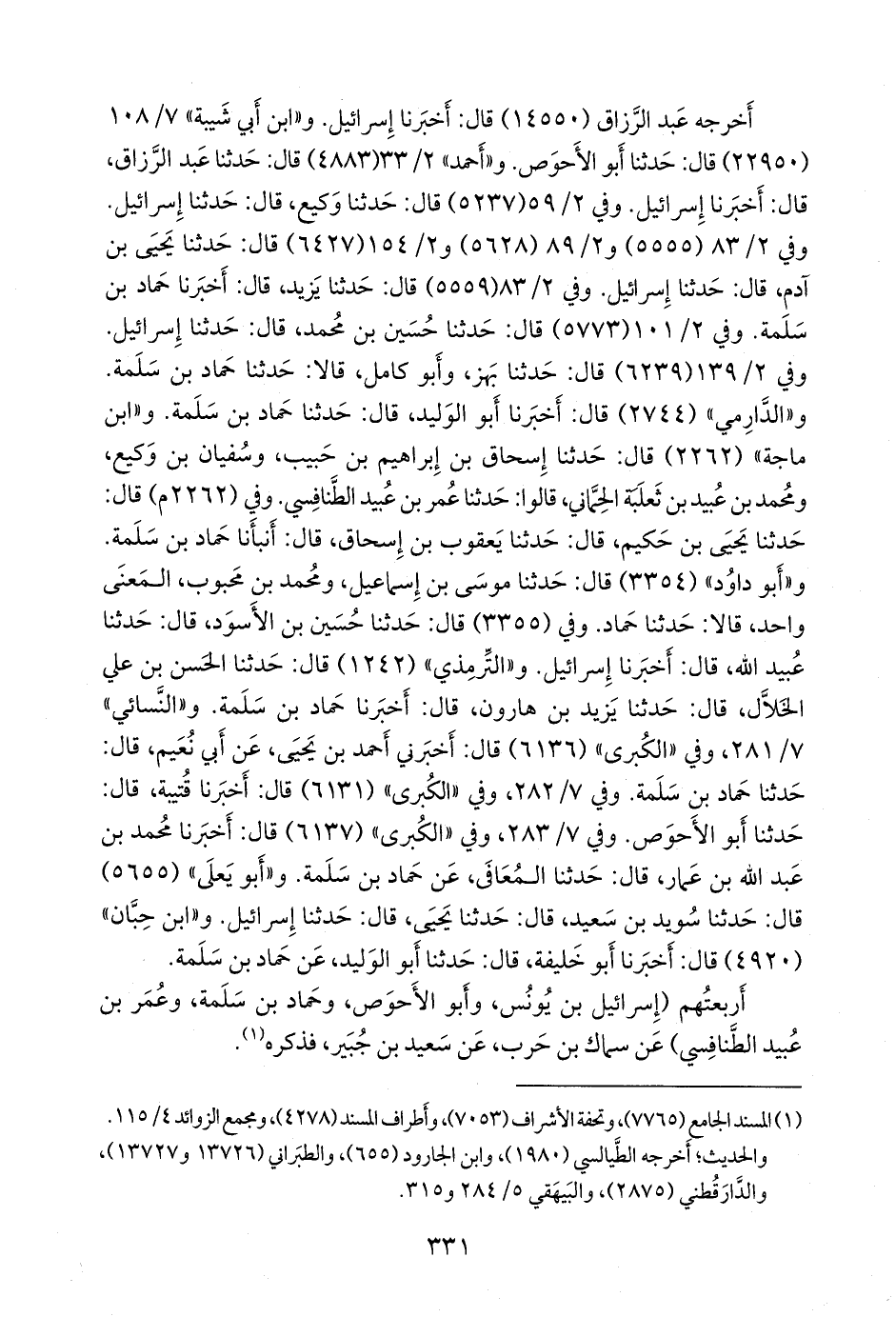 وفي ٢/ ١٣٩ (٦٢٣٩) قال: حدثنا بَهز، وأَبو كامل، قالا: حدثنا حماد بن سلمة. و «الدَّارِمي» (٢٧٤٤) قال: أخبرنا أَبو الوليد، قال: حدثنا حماد بن سلمة. و «ابن ماجة» (٢٢٦٢) قال: حدثنا إسحاق بن إبراهيم بن حبيب، وسفيان بن وكيع، ومحمد بن عبيد بن ثعلبة الحماني، قالوا: حدثنا عمر بن عُبيد الطنافسي. وفي (٢٢٦٢ م) قال: حدثنا يحيى بن حكيم، قال: حدثنا يعقوب بن إسحاق، قال: أنبأنا حماد بن سلمة. و «أَبو داود» (٣٣٥٤) قال: حدثنا موسى بن إسماعيل، ومحمد بن محبوب، المعنى واحد، قالا: حدثنا حماد. وفي (٣٣٥٥) قال: حدثنا حسين بن الأسود، قال: حدثنا عُبيد الله، قال: أخبرنا إسرائيل. و «التِّرمِذي» (١٢٤٢) قال: حدثنا الحسن بن علي الخَلَّال، قال: حدثنا يزيد بن هارون، قال: أخبرنا حماد بن سلمة. و «النَّسَائي» ٧/ ٢٨١، وفي «الكبرى» (٦١٣٦) قال: أخبرني أحمد بن يحيى، عن أبي نعيم، قال: حدثنا حماد بن سلمة. وفي ٧/ ٢٨٢، وفي «الكبرى» (٦١٣١) قال: أخبرنا قتيبة، قال: حدثنا أَبو الأحوص. وفي ٧/ ٢٨٣، وفي «الكبرى» (٦١٣٧) قال: أخبرنا محمد بن عبد الله بن عمار، قال: حدثنا المعافى، عن حماد بن سلمة. و «أَبو يَعلى» (٥٦٥٥) قال: حدثنا سويد بن سعيد، قال: حدثنا يحيى، قال: حدثنا إسرائيل. و «ابن حِبَّان» (٤٩٢٠) قال: أخبرنا أَبو خليفة، قال: حدثنا أَبو الوليد، عن حماد بن سلمة.