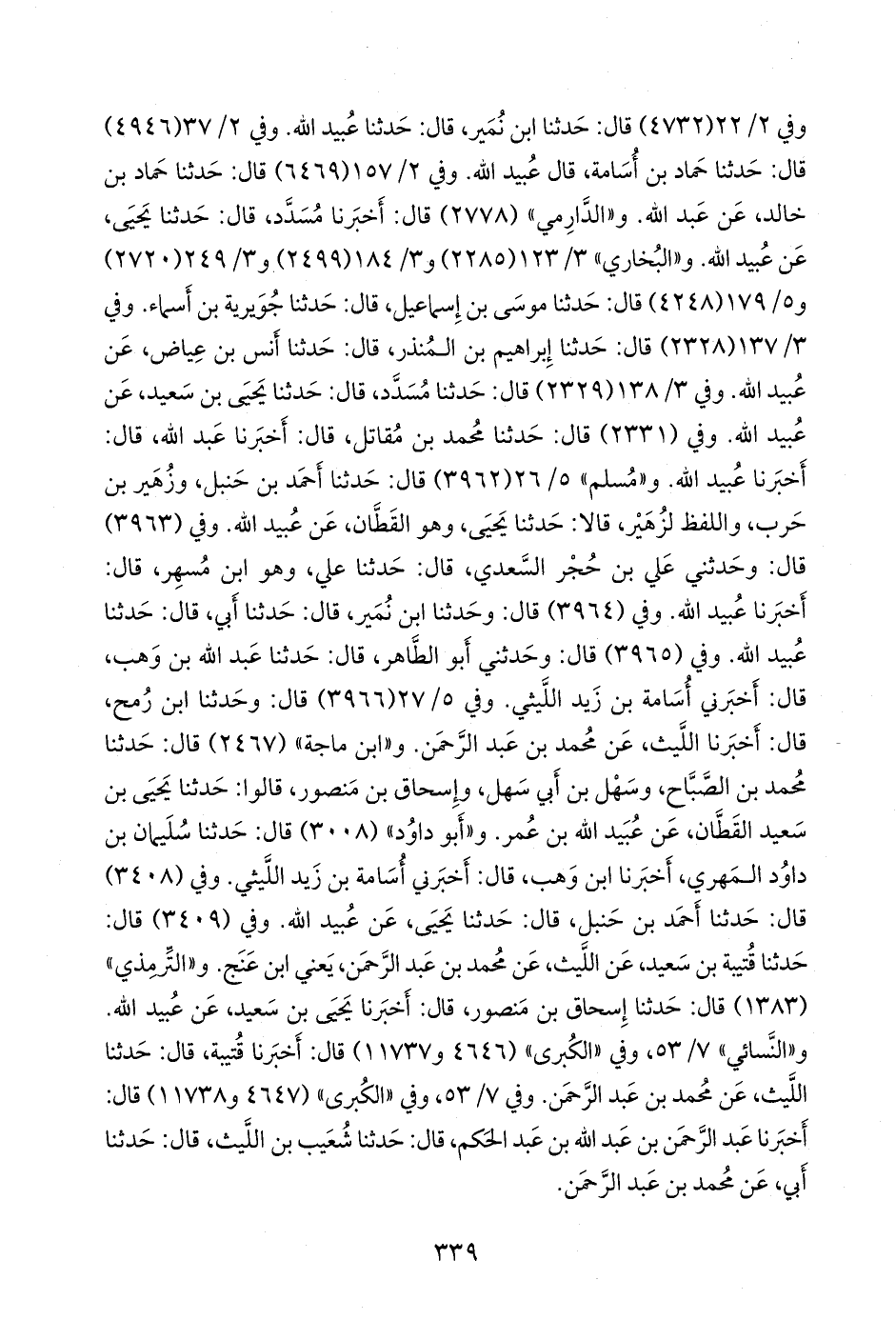 وفي ٢/ ٣٧ (٤٩٤٦) قال: حدثنا حماد بن أُسامة، قال عُبيد الله. وفي ٢/ ١٥٧ (٦٤٦٩) قال: حدثنا حماد بن خالد، عن عبد الله. و «الدَّارِمي» (٢٧٧٨) قال: أخبرنا مُسدد، قال: حدثنا يحيى، عن عُبيد الله. و «البخاري» ٣/ ٩٤ (٢٢٨٥) و ٣/ ١٤٠ (٢٤٩٩) و ٣/ ١٩٠ (٢٧٢٠) و ٥/ ١٤٠ (٤٢٤٨) قال: حدثنا موسى بن إسماعيل، قال: حدثنا جويرية بن أسماء. وفي ٣/ ١٠٤ (٢٣٢٨) قال: حدثنا إبراهيم بن المنذر، قال: حدثنا أَنس بن عياض، عن عُبيد الله. وفي ٣/ ١٠٥ (٢٣٢٩) قال: حدثنا مُسدد، قال: حدثنا يحيى بن سعيد، عن عُبيد الله. وفي (٢٣٣١) قال: حدثنا محمد بن مقاتل، قال: أخبرنا عبد الله، قال: أخبرنا عُبيد الله. و «مسلم» ٥/ ٢٦ (٣٩٦٢) قال: حدثنا أحمد بن حنبل، وزهير بن حرب، واللفظ لزهير، قالا: حدثنا يحيى، وهو القطان، عن عُبيد الله. وفي (٣٩٦٣) قال: وحدثني علي بن حُجْر السعدي، قال: حدثنا علي، وهو ابن مُسهِر، قال: أخبرنا عُبيد الله. وفي (٣٩٦٤) قال: وحدثنا ابن نُمير، قال: حدثنا أبي، قال: حدثنا عُبيد الله. وفي (٣٩٦٥) قال: وحدثني أَبو الطاهر، قال: حدثنا عبد الله بن وهب، قال: أخبرني أُسامة بن زيد الليثي. وفي ٥/ ٢٧ (٣٩٦٦) قال: وحدثنا ابن رمح، قال: أخبرنا الليث، عن محمد بن عبد الرَّحمَن. و «ابن ماجة» (٢٤٦٧) قال: حدثنا محمد بن الصباح، وسهل بن أبي سهل، وإسحاق بن منصور، قالوا: حدثنا يحيى بن سعيد القطان، عن عُبيد الله بن عمر. و «أَبو داود» (٣٠٠٨) قال: حدثنا سليمان بن داود المهري، قال: أخبرنا ابن وهب، قال: أخبرني أُسامة بن زيد الليثي. وفي (٣٤٠٨) قال: حدثنا أحمد بن حنبل، قال: حدثنا يحيى، عن عُبيد الله.