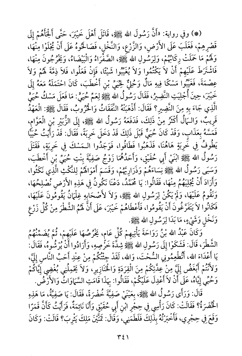 - وفي رواية: «أن رسول الله صَلى الله عَليه وسَلم قاتل أهل خيبر، حتى ألجأهم إلى قصرهم، فغلب على الأرض، والزرع، والنخل، فصالحوه على أن يجلوا منها، ولهم ما حملت ركابهم، ولرسول الله صَلى الله عَليه وسَلم الصفراء والبيضاء، ويخرجون منها، فاشترط عليهم أن لا يكتموا ولا يغيبوا شيئا، فإن فعلوا، فلا ذمة لهم ولا عصمة، فغيبوا مسكا فيه مال وحلي لحيي بن أخطب، كان احتمله معه إلى خيبر، حين أجليت النضير، فقال رسول الله صَلى الله عَليه وسَلم لعم حيي: ما فعل مسك حيي الذي جاء به من النضير؟ فقال: أذهبته النفقات والحروب، فقال صَلى الله عَليه وسَلم: العهد قريب، والمال أكثر من ذلك، فدفعه رسول الله صَلى الله عَليه وسَلم إلى الزبير بن العوام، فمسه بعذاب، وقد كان حيي قبل ذلك قد دخل خربة، فقال: قد رأيت حييا يطوف في خربة هاهنا، فذهبوا فطافوا، فوجدوا المسك في خربة، فقتل رسول الله صَلى الله عَليه وسَلم ابني أبي حقيق، وأحدهما زوج صفية بنت حيي بن أخطب، وسبى رسول الله صَلى الله عَليه وسَلم نساءهم وذراريهم، وقسم أموالهم للنكث الذي نكثوا، وأراد أن يجليهم منها، فقالوا: يا محمد، دعنا نكون في هذه الأرض نصلحها، ونقوم عليها، ولم يكن لرسول الله صَلى الله عَليه وسَلم ولا لأصحابه غِلمان يقومون عليها، فكانوا لا يتفرغون أن يقوموا، فأعطاهم خيبر، على أن لهم الشطر من كل زرع ونخل وشيء، ما بدا لرسول الله صَلى الله عَليه وسَلم.