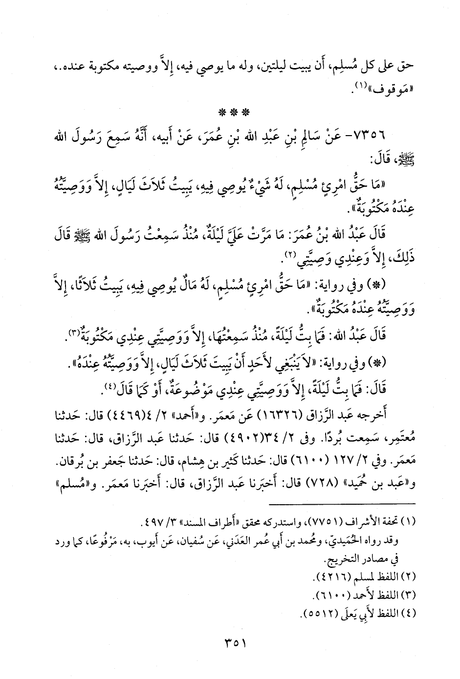 - وفي رواية: «لا ينبغي لأحد أن يبيت ثلاث ليال، إلا ووصيته عنده».
