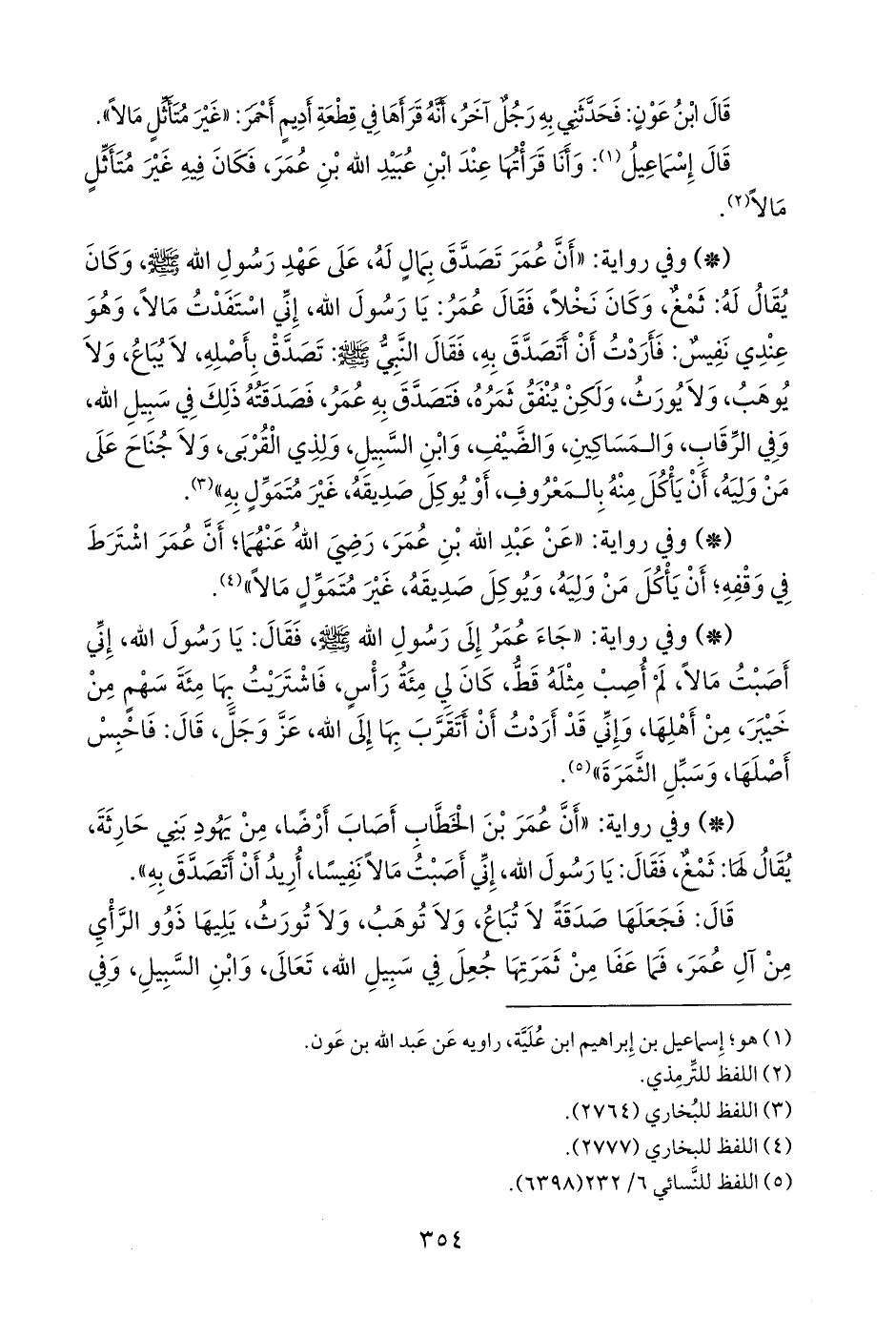 - وفي رواية: «عن ابن عمر، قال: أول صدقة كانت في الإسلام صدقة عمر، فقال له رسول الله صَلى الله عَليه وسَلم: احبس أصولها، وسبل ثمرتها» (¬٤).