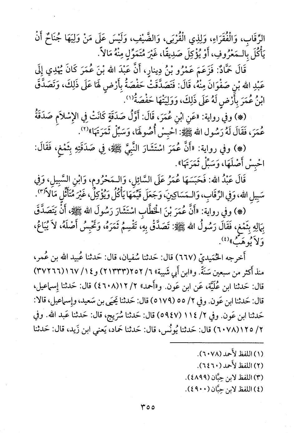 قال عبد الله: فحبسها عمر على السائل، والمحروم، وابن السبيل، وفي سبيل الله، وفي الرقاب، والمساكين، وجعل قيمها يأكل ويؤكل، غير متأثل مالا (¬١).
