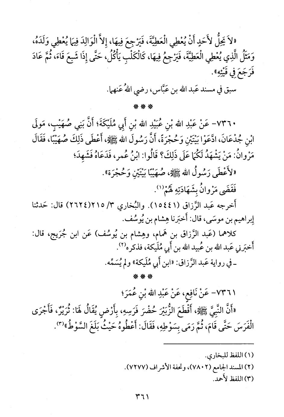 ٧٣٦٠ - عن عبد الله بن عُبيد الله بن أَبي مُليكة؛ أن بني صهيب مولى ابن جدعان، ادعوا بيتين وحجرة، أن رسول الله صَلى الله عَليه وسَلم أعطى ذلك صهيبا، فقال مروان: من يشهد لكما على ذلك؟ قالوا: ابن عمر، فدعاه فشهد؛
