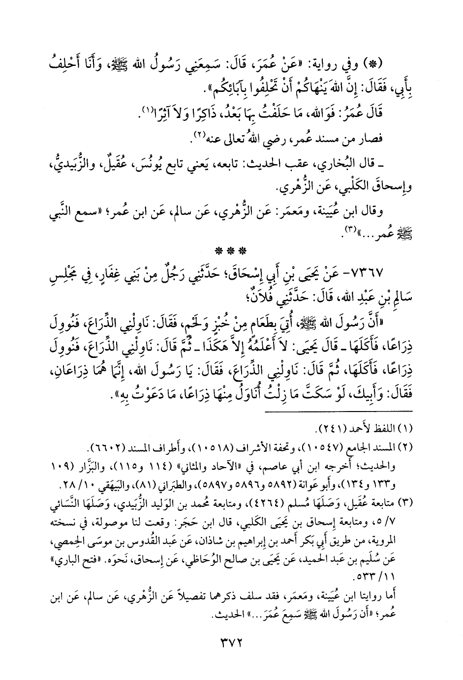«أن رسول الله صَلى الله عَليه وسَلم أتي بطعام من خبز ولحم، فقال: ناولني الذراع، فنوول ذراعا، فأكلها ـ قال يحيى: لا أعلمه إلا هكذا ـ ثم قال: ناولني الذراع، فنوول ذراعا، فأكلها، ثم قال: ناولني الذراع، فقال: يا رسول الله، إنما هما ذراعان، فقال: وأبيك، لو سكت ما زلت أناول منها ذراعا، ما دعوت به».