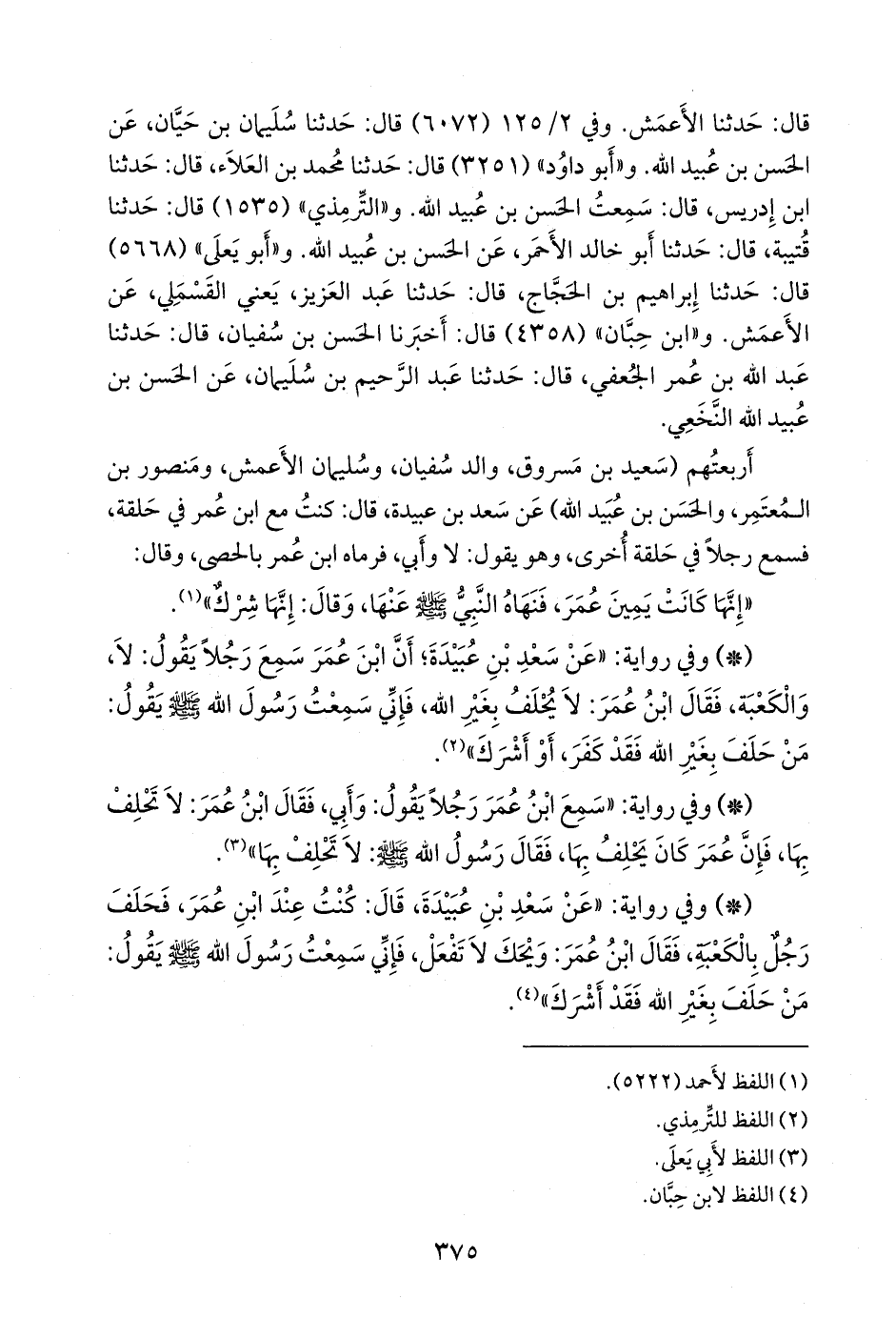- وفي رواية: «عن سعد بن عُبَيدة، قال: كنت عند ابن عمر، فحلف رجل بالكعبة، فقال ابن عمر: ويحك لا تفعل، فإني سمعت رسول الله صَلى الله عَليه وسَلم يقول: من حلف بغير الله فقد أشرك» (¬٢).