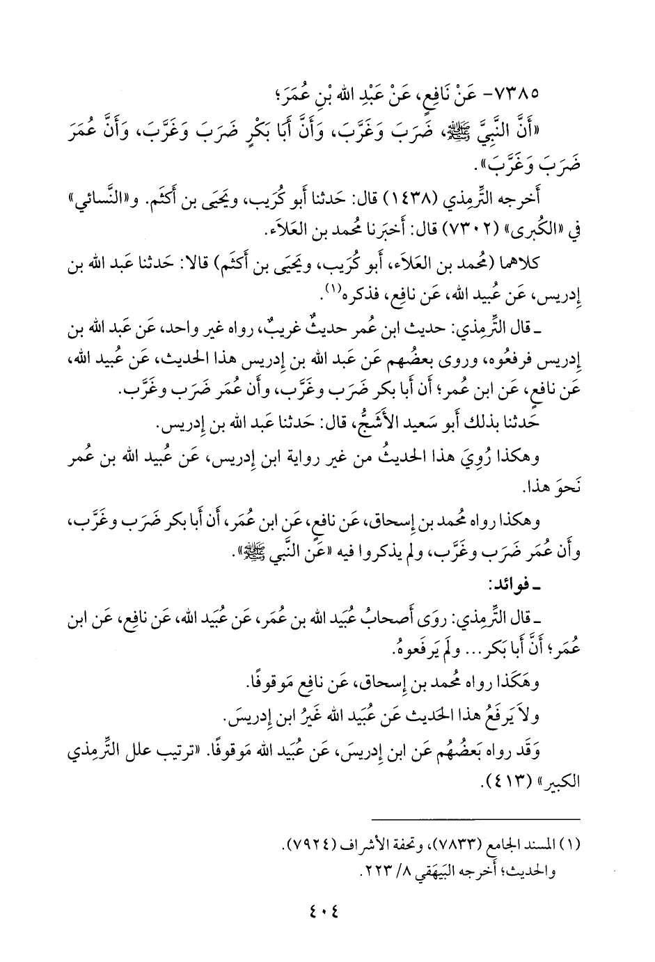 - قال التِّرمِذي: روى أَصحابُ عُبيد الله بن عمر، عن عُبيد الله، عن نافع، عن ابن عمر؛ أَن أَبا بكر، ولم يرفَعوه.