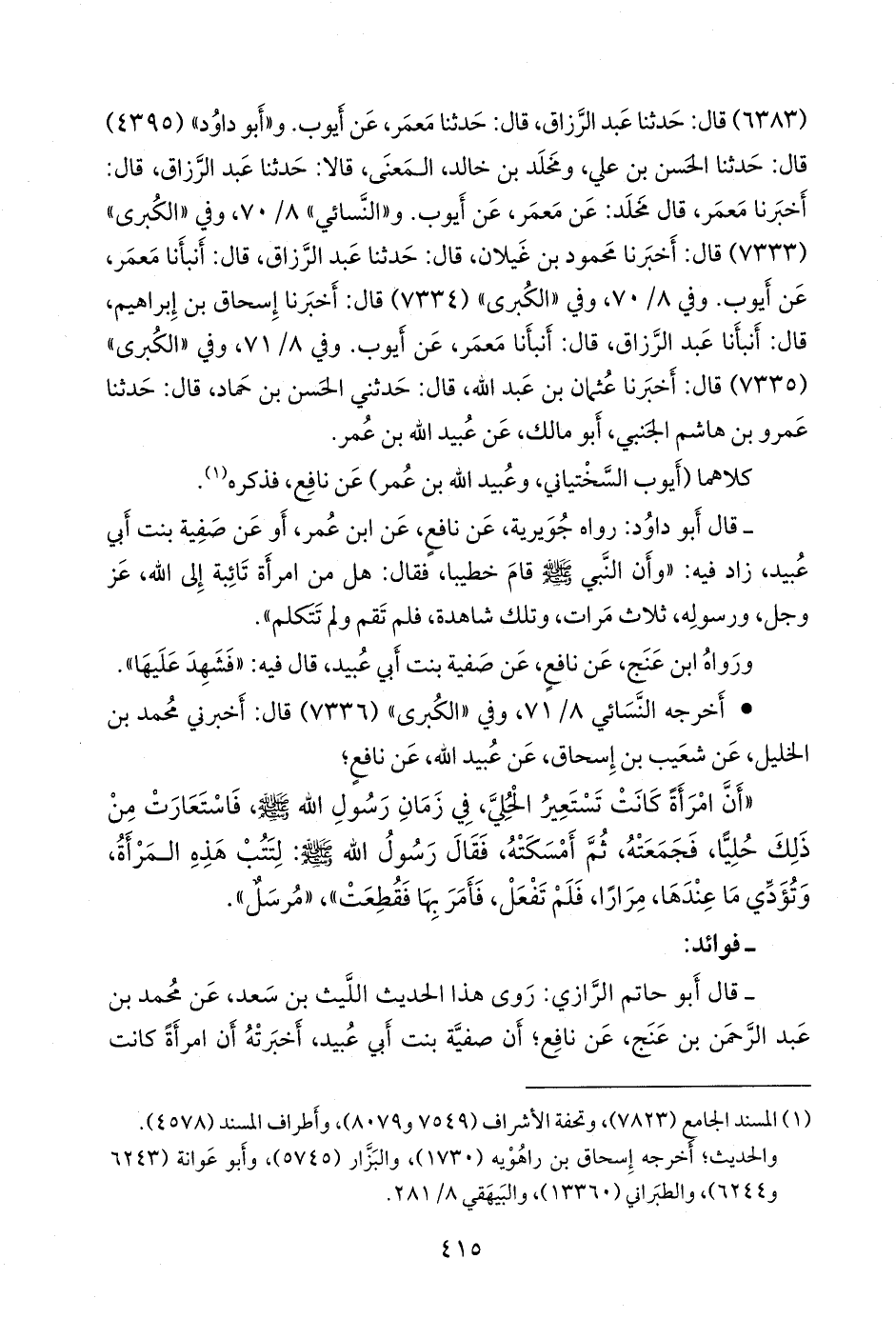 - قال أَبو حاتم الرازي: روى هذا الحديث الليث بن سعد، عن محمد بن عبد الرَّحمَن بن عنج، عن نافع؛ أن صفية بنت أبي عبيد، أخبرته أن امرأة كانت