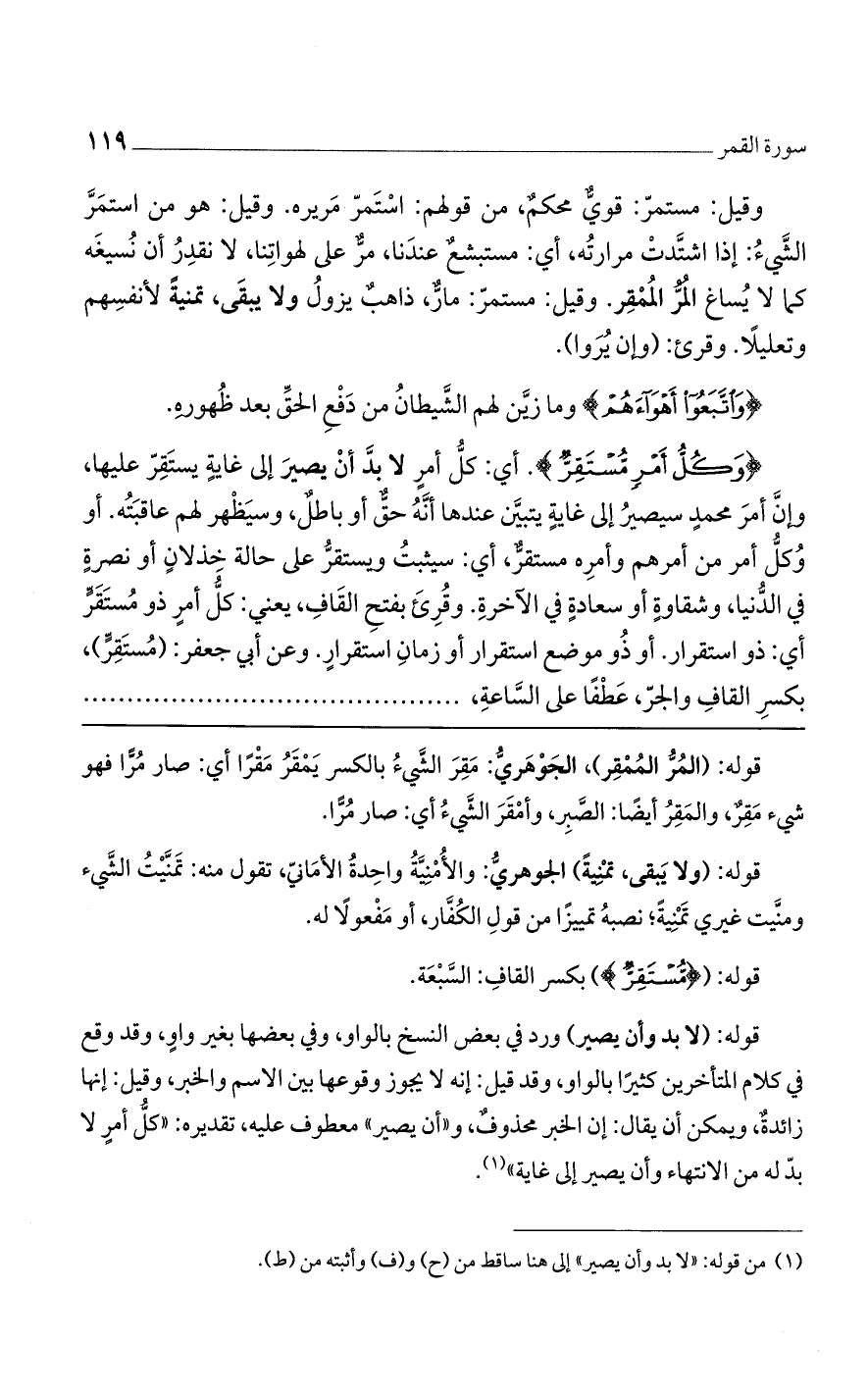 وقيل: مستمر: قوي محكم، من قولهم: استمر مريره. وقيل: هو من استمر الشيء. إذا اشتدت مرارته، أي: مستبشع عندنا، مر على لهواتنا، لا نقدر أن نسيغه كما لا يساغ المر الممقر. وقيل: مستمر: مارا، ذاهب يزول ولا يبقى، تمنية لأنفسهم وتعليلا. وقرئ: (وإن يروا).
