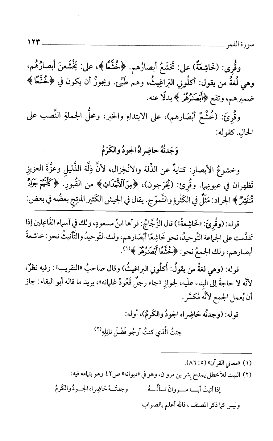 قوله: (وقرئ: "خاشعة") قال الزجاج: قرأها ابن مسعود، ولك في أسماء الفاعلين إذا تقدمت على الجماعة التوحيد، نحو خاشعًا أبصارهم، ولك التوحيد والتأنيث نحو: خاشعة أبصارهم، ولك الجمع نحو: {خُشَّعًا أَبْصَارُهُمْ}.