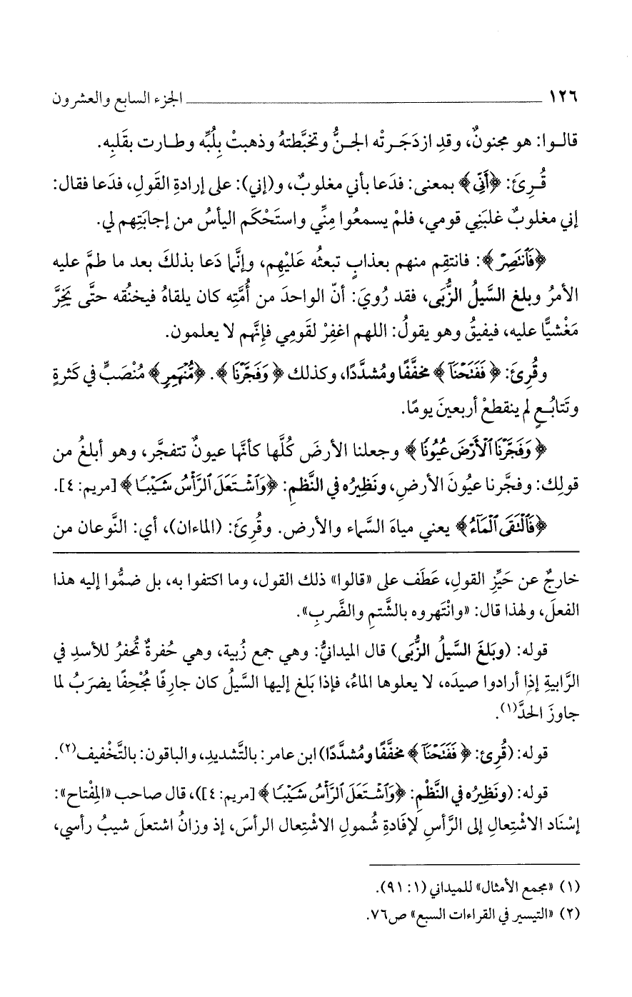{وفَجَّرْنَا الأَرْضَ عُيُونًا} وجعلنا الأرض كلها كأنها عيون تنفجر، وهو أبلغ من قولك: وفجرنا عيون الأرض، ونظيره في النظم: {واشْتَعَلَ الرَّاسُ شَيْبًا} [مريم: 4].