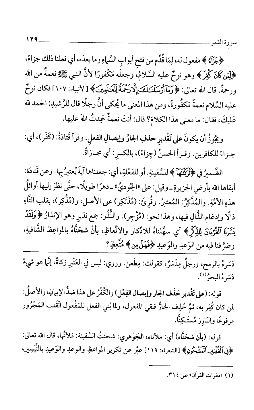 {جَزَاءً} مفعول له، لما قدم من فتح أبواب السماء وما بعده، أي فعلنا ذلك جزاء، {لِّمَن كَانَ كُفِرَ} وهو نوح عليه السلام، وجعله مكفورا لأن النبي صلى الله عليه وسلم نعمة من الله ورحمة. قال الله تعالى: ومَا أَرْسَلْنَاكَ إلاَّ رَحْمَةً لِّلْعَالَمِينَ} [الأنبياء: 107] فكان نوح عليه السلام نعمة مكفورة، ومن هذا المعنى ما يحكى أن رجلا قال للرشيد: الحمد لله عليك، فقال: ما معنى هذا الكلام؟ قال: أنت نعمة حمدت الله عليها.