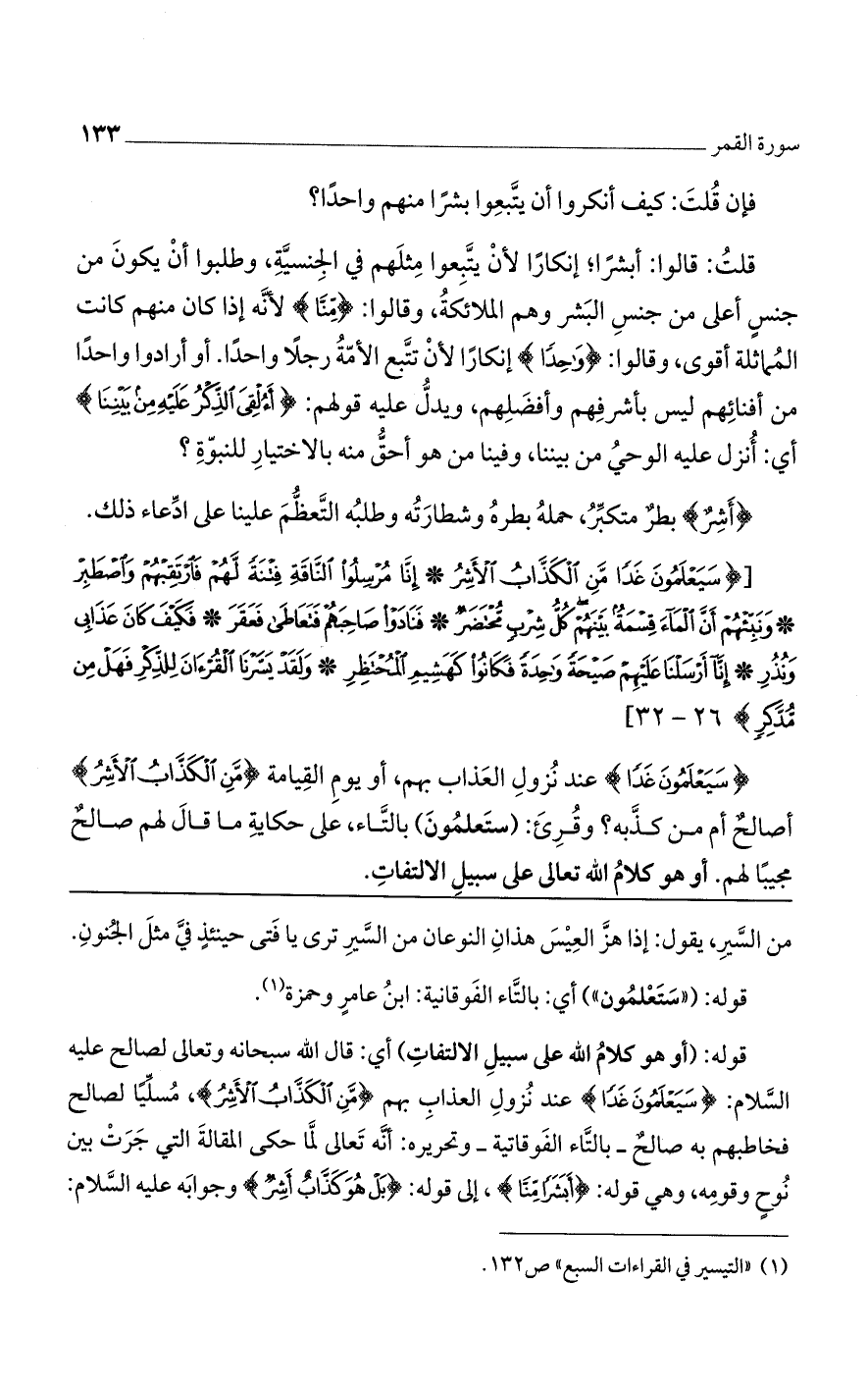 [{سَيَعْلَمُونَ غَدًا مَّنِ الكَذَّابُ الأَشِرُ * إنَّا مُرْسِلُوا النَّاقَةِ فِتْنَةً لَّهُمْ فَارْتَقِبْهُمْ واصْطَبِرْ * ونَبِّئْهُمْ أَنَّ المَاءَ قِسْمَةٌ بَينَهُمْ كُلُّ شِرْبٍ مُّحْتَضَرٌ * فَنَادَوْا صَاحِبَهُمْ فَتَعَاطَى فَعَقَرَ * فَكَيْفَ كَانَ عَذَابِي ونُذُرِ * إنَّا أَرْسَلْنَا عَلَيْهِمْ صَيْحَةً واحِدَةً فَكَانُوا كَهَشِيمِ المُحْتَظِرِ * ولَقَدْ يَسَّرْنَا القُرْآنَ لِلذِّكْرِ فَهَلْ مِن مُّدَّكِرٍ} 26 - 32}.