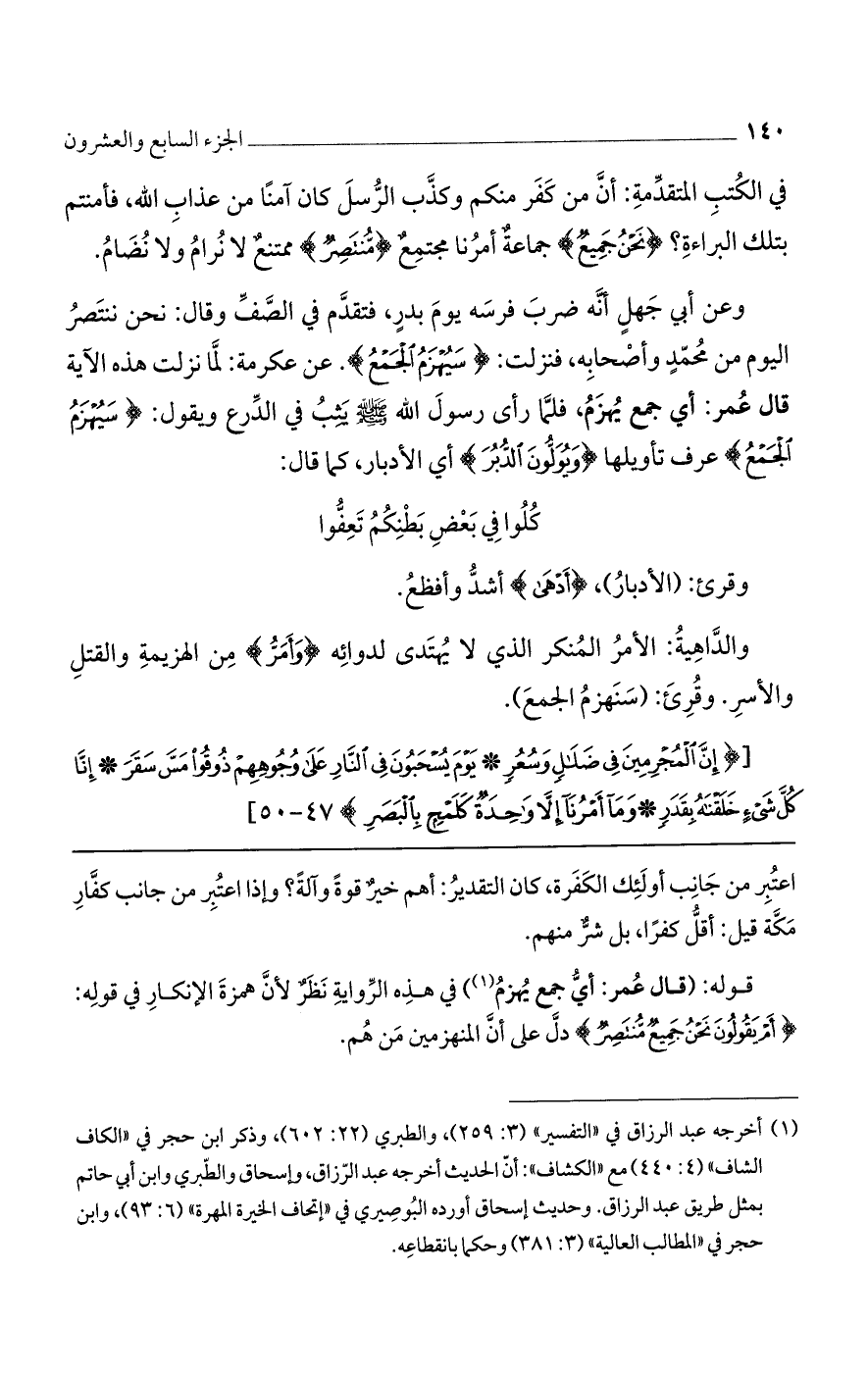 وعن أبي جهل أنه ضرب فرسه يوم بدر، فتقدم في الصف وقال: نحن ننتصر اليوم من محمد وأصحابه، فنزلت: {سَيُهْزَمُ الجَمْعُ} عرف تأويلها {ويُوَلُّونَ الدُّبُرَ} أي الأدبار، كما قال:
