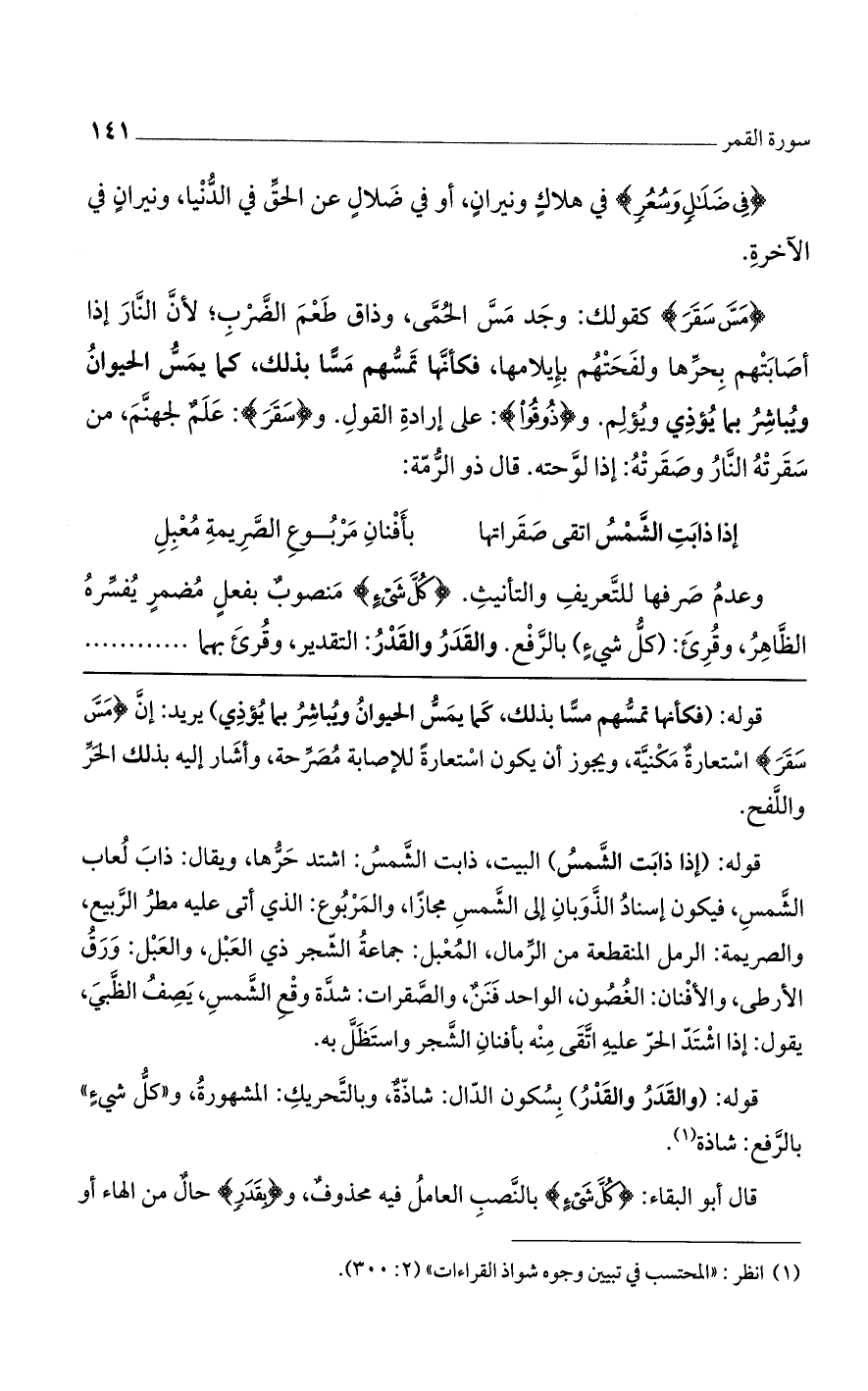 قوله: (فكأنها تمسهم مسًا بذلك، كما يمس الحيوان ويباشر بما يؤذي) يريد: إن {مَسَّ سَقَرَ} استعارة مكنية، ويجوز أن يكون استعارة للإصابة مصرحة، وأشار إليه بذلك الحر واللفح.
