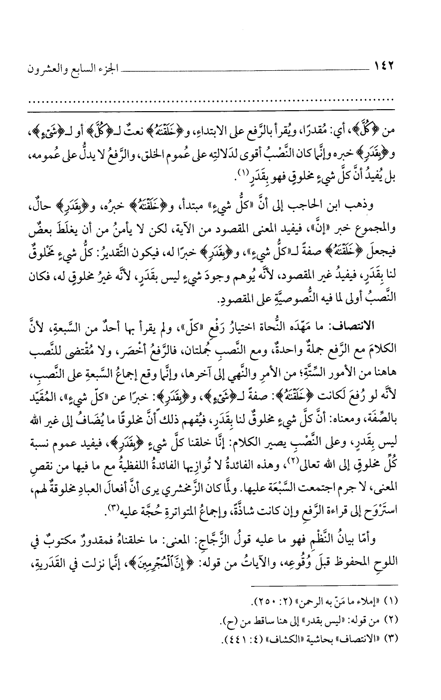وذهب ابن الحاجب إلى أن "كل شيء" مبتدأ، و {خَلَقْنَاهُ} خبره، و {بِقَدَرٍ} حال، والمجموع خبر "إن"، فيفيد المعنى المقصود من الآية، لكن لا يأمن من أن يغلط بعض فيجعل {خَلَقْنَاهُ} صفة لـ"كل شيء"، و {بِقَدَرٍ} خبرًا له، فيكون التقدير: كل شيء مخلوق لنا بقدر، فيفيد غير المقصود، لأنه يوهم وجود شيء ليس بقدر، لأنه غير مخلوق له، فكان النصب أولى لما فيه النصوصية على المقصود.