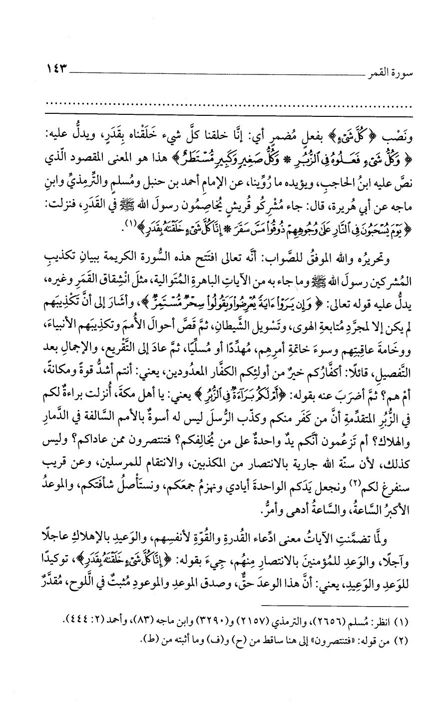 ونصب {كُلَّ شَيْءٍ} بفعل مضمر أي: إنا خلقنا كل شيء خلقناه بقدر، ويدل عليه: {وكُلُّ شَيْءٍ فَعَلُوهُ فِي الزُّبُرِ * وكُلُّ صَغِيرٍ وكَبِيرٍ مُّسْتَطَرٌ} هذا هو المعنى المقصود الذي نص عليه ابن الحاجب، ويؤيده ما روينا، عن الإمام أحمد بن حنبل ومسلم والترمذي وابن ماجه عن أبي هريرة، قال: جاء مشرك قريش يخاصمون رسول الله صلى الله عليه وسلم في القدر، فنزلت: {يَوْمَ يُسْحَبُونَ فِي النَّارِ عَلَى وجُوهِهِمْ ذُوقُوا مَسَّ سَقَرَ * إنَّا كُلَّ شَيْءٍ خَلَقْنَاهُ بِقَدَرٍ}.