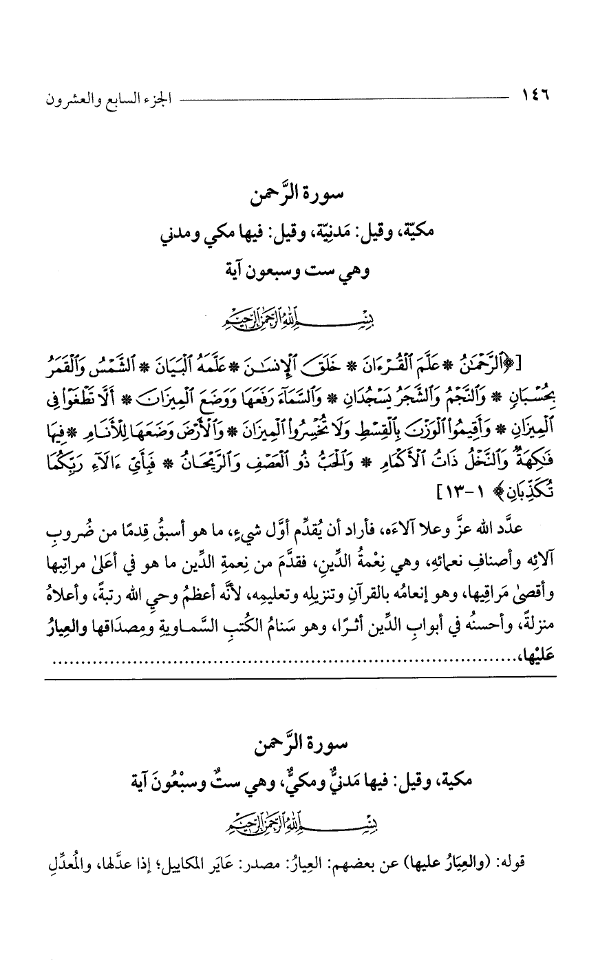 [{الرَّحْمَنُ * عَلَّمَ القُرْآنَ * خَلَقَ الإنسَانَ * عَلَّمَهُ البَيَانَ * الشَّمْسُ والْقَمَرُ بِحُسْبَانٍ * والنَّجْمُ والشَّجَرُ يَسْجُدَانِ * والسَّمَاءَ رَفَعَهَا ووَضَعَ المِيزَانَ * أَلاَّ تَطْغَوْا فِي المِيزَانِ * وأَقِيمُوا الوَزْنَ بِالْقِسْطِ ولا تُخْسِرُوا المِيزَانَ * والأَرْضَ وضَعَهَا لِلأَنَامِ * فِيهَا فَاكِهَةٌ والنَّخْلُ ذَاتُ الأَكْمَامِ * والْحَبُّ ذُو العَصْفِ والرَّيْحَانُ * فَبِأَيِّ آلاءِ رَبِّكُمَا تُكَذِّبَانِ} 1 - 13].