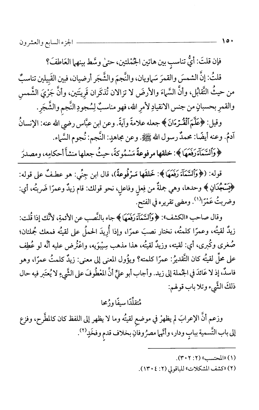 وقال صاحب "الكاشف": {والسَّمَاءَ رَفَعَهَا} جاء بالنصب عن الأئمة، لأنك إذا قلت: زيد لقيته، وعمرًا كلمته، نختار نصب عمرًا، وإذا أريد الحمل على لقيته فمعك جملتان؛ صغرى وكبرى، أي لقيته، وزيدًا لقيته، هذا مذهب سيبويه، واعترض عليه أنه لو عطف على محل لقيته كان التقدير: عمرًا كلمته؟ ويؤول المعنى إلى معنى: زيد كلمت عمرًا، وهو فاسد، إذ لا عائد في الجملة إلى زيد. وأجاب أبو علي أن المعطوف على الشيء لا يعتبر فيه حال ذلك الشيء وتلا باب قولهم: