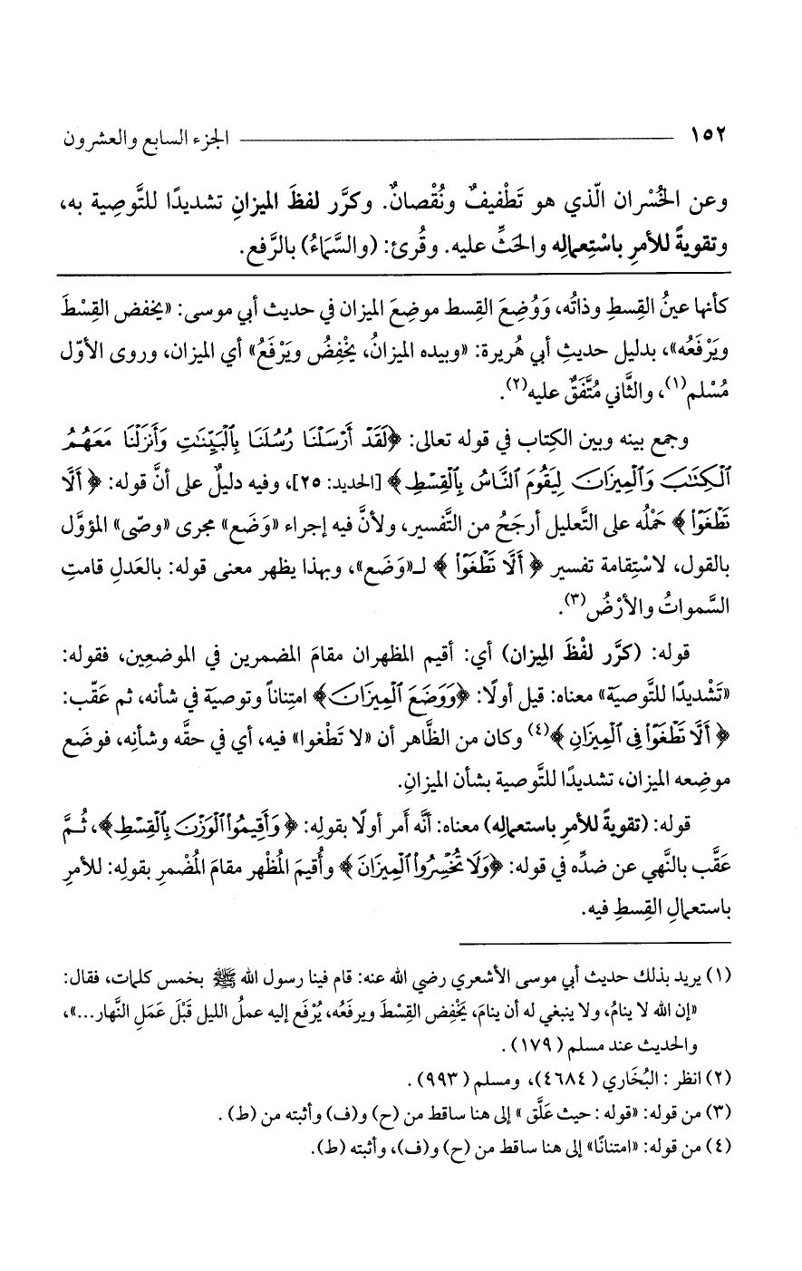 وجمع بينه وبين الكتاب في قوله تعالى: {لَقَدْ أَرْسَلْنَا رُسُلَنَا بِالْبَيِّنَاتِ وَأَنْزَلْنَا مَعَهُمُ الْكِتَابَ وَالْمِيزَانَ لِيَقُومَ النَّاسُ بِالْقِسْطِ} [الحديد: 25]، وفيه دليل على أن قوله: {أَلاَّ تَطْغَوْا} حمله على التعليل أرجح من التفسير، ولأن فيه إجراء "مجرى "وصى" المؤول بالقول، لاستقامة تفسير {أَلاَّ تَطْغَوْا} لـ "وضع"، وبهذا يظهر معنى قوله: بالعدل قامت السموات والأرض.