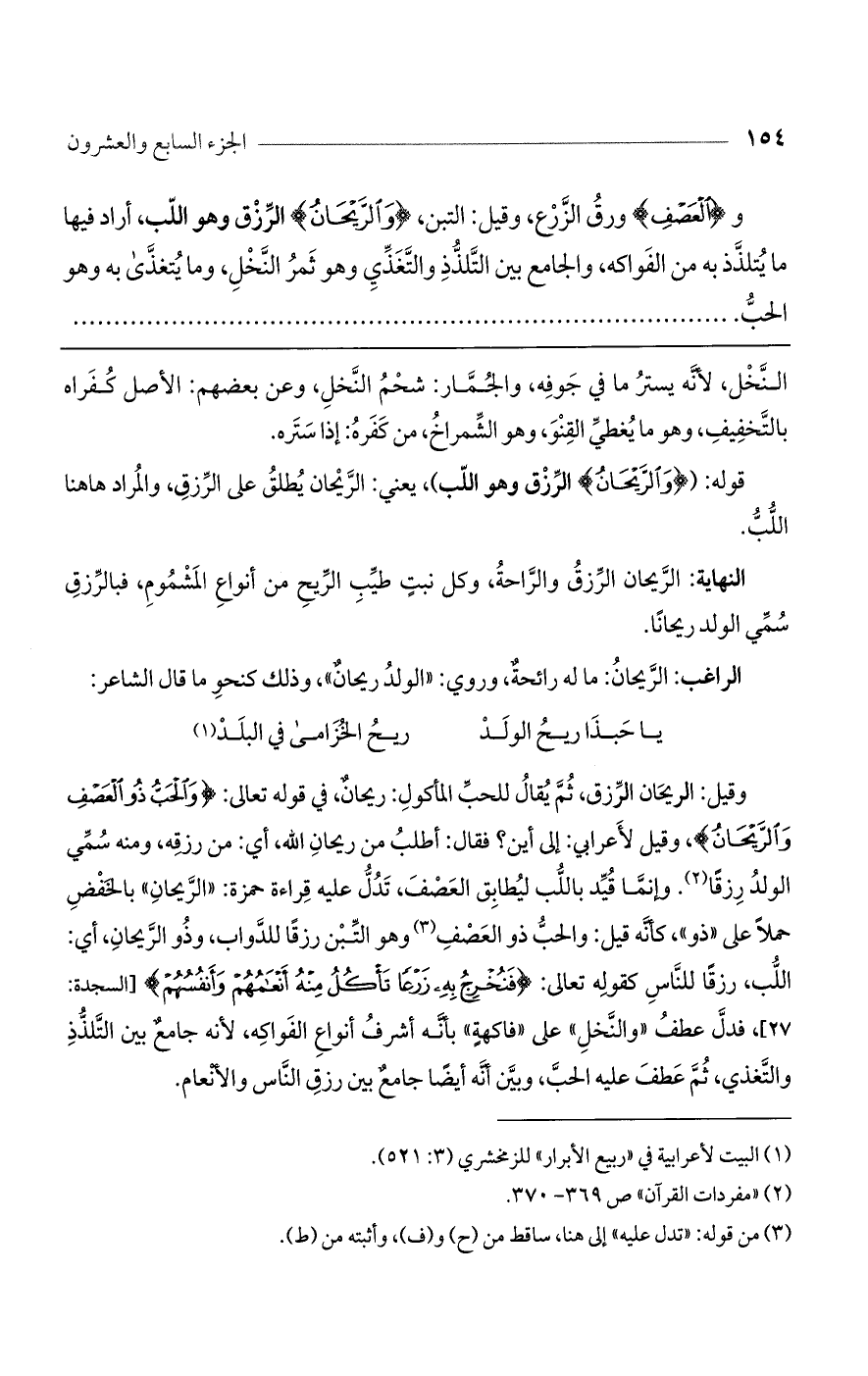 وقيل: الريحان الرزق، ثم يقال للحب المأكول: ريحان، في قوله تعالى: {والْحَبُّ ذُو العَصْفِ والرَّيْحَانُ}، وقيل لأعرابي: إلى أين؟ فقال: أطلب من ريحان الله، أي: من رزقه، ومنه سمي حملًا على "ذو"، كأنه قيل: والحب ذو العصف وهو التبن رزقًا للدواب، وذو الريحان، أي: اللب، رزقًا للناس كقوله تعالى: {فَنُخْرِجُ بِهِ زَرْعًا تَاكُلُ مِنْهُ أَنْعَامُهُمْ وَأَنْفُسُهُمْ} [السجدة: 27]، فدل عطف "والنخل" على "فاكهة" بأنه أشرف أنواع الفواكه، لأنه جامع بين التلذذ والتغذي، ثم عطف عليه الحب، وبين أنه أيضًا جامع بين رزق الناس والأنعام.