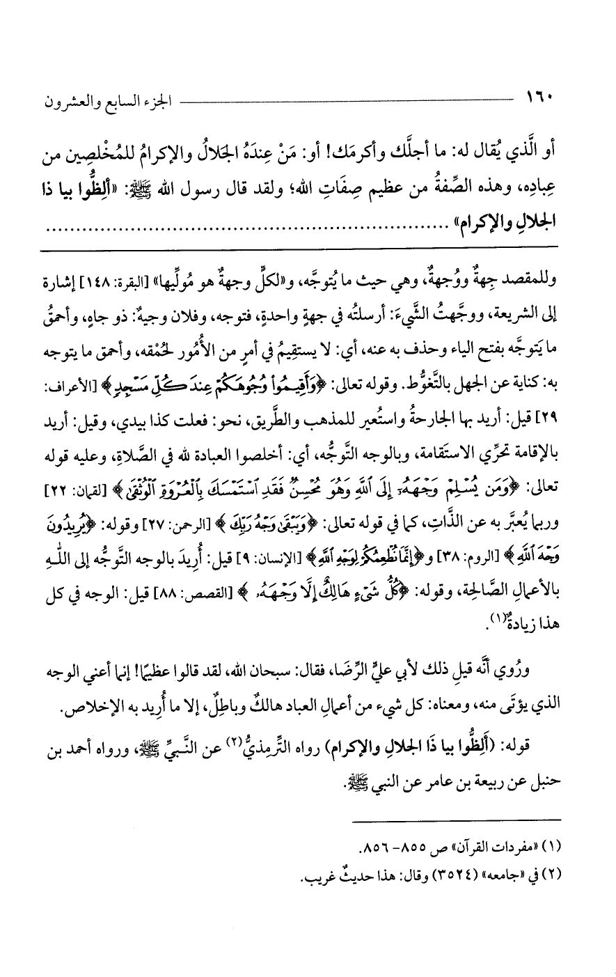 وللمقصد جهة ووجهة، وهي حيث ما يتوجه، و"لكل وجهة هو موليها" إشارة إلى الشريعة، ووجهت الشيء: أرسلته في جهة واحدة، فتوجه، وفلان وجيه: ذو جاه، وأحمق ما يتوجه بفتح الياء وحذف يه عنه، أي: لا يستقيم في أمر من الأمور لحمقه، وأحمق ما يتوجه به: كناية عن الجهل بالتغوط. وقوله تعالى: {وَأَقِيمُوا وُجُوهَكُمْ عِنْدَ كُلِّ مَسْجِدٍ} [الأعراف: 29] قيل: أريد بها الجارحة واستعير للمذهب والطريق، نحو: فعلت كذا بيدي، وقيل: أريد بالإقامة تحري الاستقامة، وبالوجه التوجه، أي: أخلصوا العبادة لله في الصلاة، وعليه قوله تعالى: {وَمَنْ يُسْلِمْ وَجْهَهُ إِلَى اللَّهِ وَهُوَ مُحْسِنٌ فَقَدِ اسْتَمْسَكَ بِالْعُرْوَةِ الْوُثْقَى} [لقمان: 22] وربما يعبر به عن الذات، كما في قوله تعالى: {ويَبْقَى وجْهُ رَبِّكَ} [الرحمن: 27] وقوله: {يُرِيدُونَ وَجْهَ اللَّهِ} [الروم: 38] و {إِنَّمَا نُطْعِمُكُمْ لِوَجْهِ اللَّهِ} [الإنسان: 9] قيل: أريد بالوجه التوجه إلى الله بالأعمال الصالحة، وقوله: {كُلُّ شَيْءٍ هَالِكٌ إِلَّا وَجْهَهُ} [القصص: 88] قيل: الوجه في كل هذا زيادة.