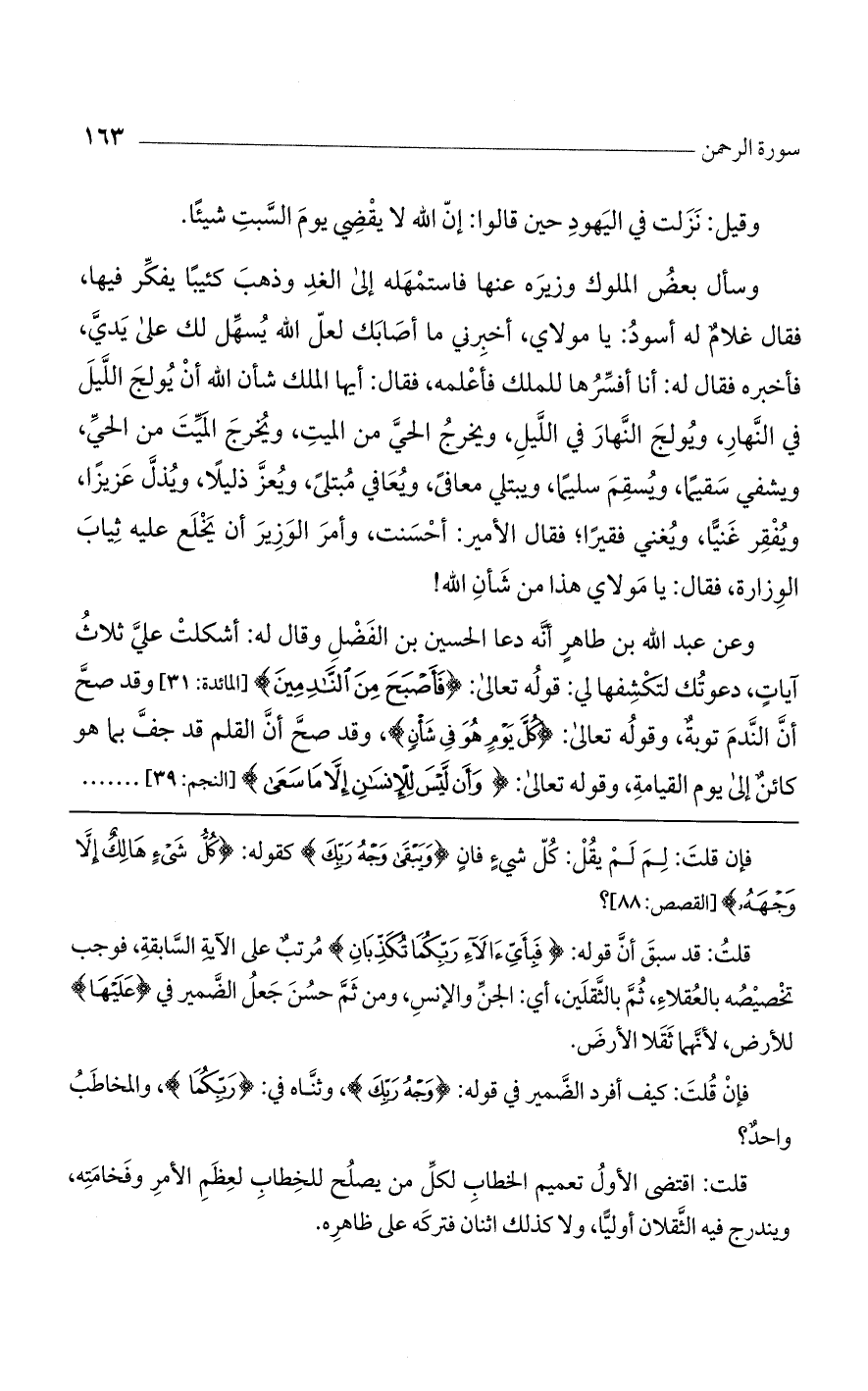 وسأل بعض الملوك وزيره عنها فاستمهله إلى الغد وذهب كئيبا يفكر فيها، فقال غلام له أسود: يا مولاي، أخبرني ما أصابك لعل الله يسهل لك على يدي، فأخبره فقال له: أنا أفسرها للملك فأعلمه، فقال: أيها الملك شأن الله أن يولج الليل في النهار، ويولج النهار في الليل، ويخرج الحي من الميت، ويخرج الميت من الحي، ويشفي سقيما، ويسقم سليما، ويبتلي معافى، ويعافى مبتلى، ويعز ذليلا، ويذل عزيزا، ويفقر غنيا، ويغني فقيرا؛ فقال الأمير: أحسنت، وأمر الوزير أن يخلع عليه ثياب الوزارة، فقال: يا مولاي هذا من شأن الله! .
