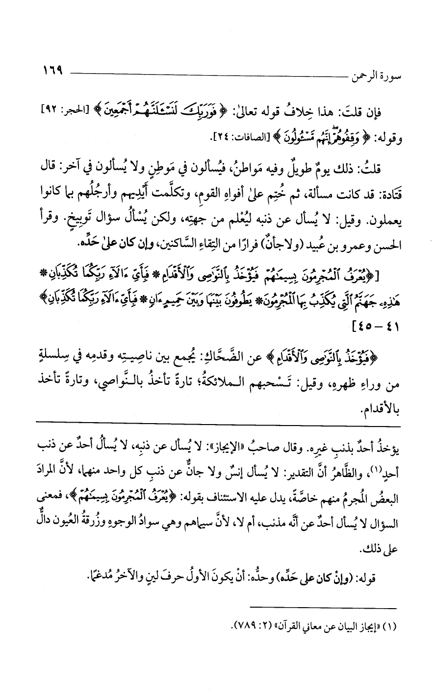 [{يُعْرَفُ المُجْرِمُونَ بِسِيمَاهُمْ فَيُؤْخَذُ بِالنَّوَاصِي والأَقْدَامِ * فَبِأَيِّ آلاءِ رَبِّكُمَا تُكَذِّبَانِ * هَذِهِ جَهَنَّمُ الَّتِي يُكَذِّبُ بِهَا المُجْرِمُونَ * يَطُوفُونَ بَيْنَهَا وبَيْنَ حَمِيمٍ آنٍ * فَبِأَيِّ آلاءِ رَبِّكُمَا تُكَذِّبَان} 41 - 45].