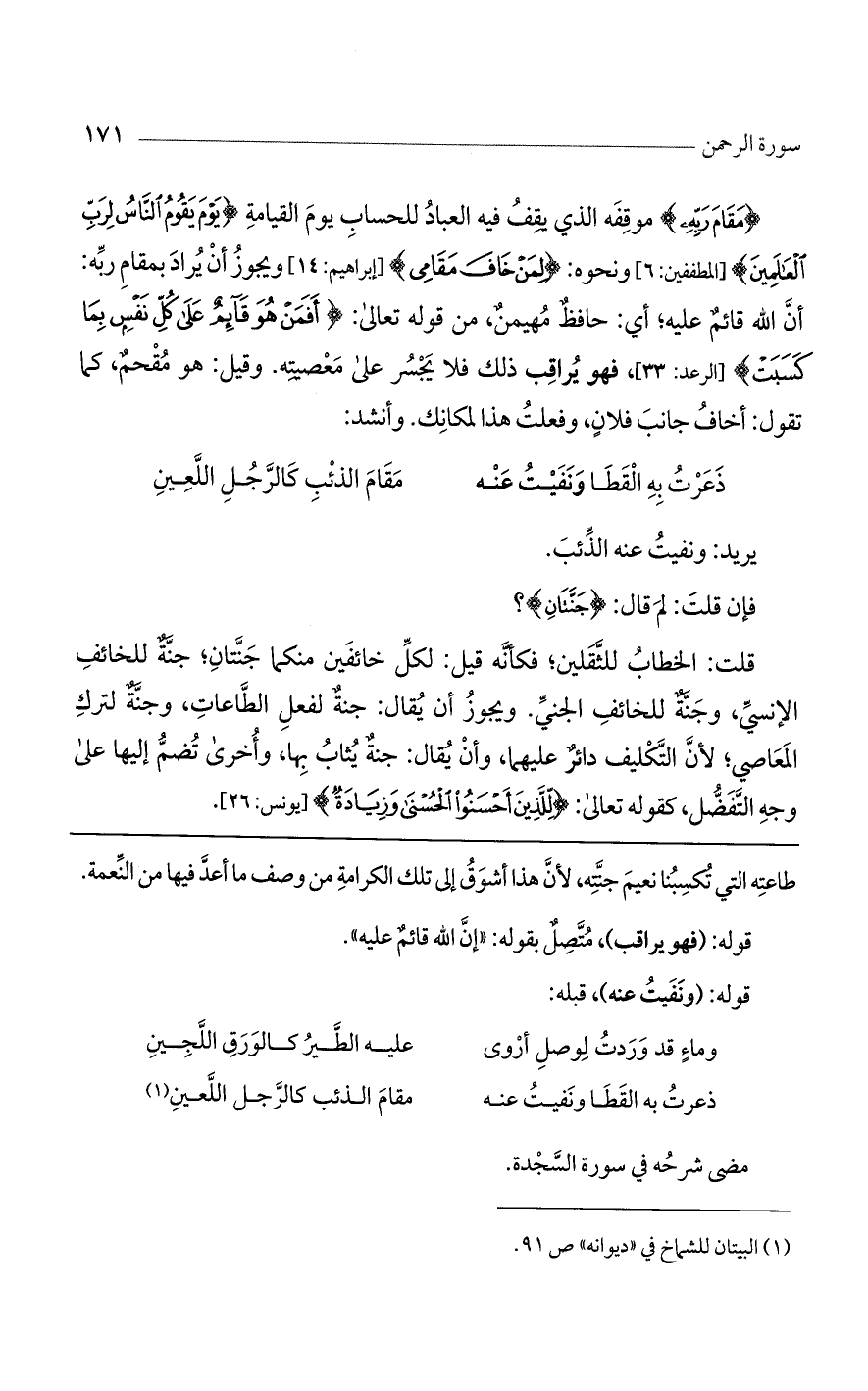 {مَقَامَ رَبِّهِ} موقفه الذي يقف فيه العباد للحساب يوم القيامة {يَوْمَ يَقُومُ النَّاسُ لِرَبِّ العَالَمِينَ} [المطففين: 6] ونحوه: {لِمَنْ خَافَ مَقَامِي} [إبراهيم: 14] ويجوز أن يراد بمقام ربه: أن الله قائم عليه؛ أي: حافظ مهيمن، من قوله تعالى: {أَفَمَنْ هُوَ قَائِمٌ عَلَى كُلِّ نَفْسٍ بِمَا كَسَبَتْ} [الرعد: 33]، فهو يراقب ذلك فلا يخسر على معصيته، وقيل: هو مقحم، كما تقول: أخاف جانب فلان، وفعلت هذا لمكانك. وأنشد: