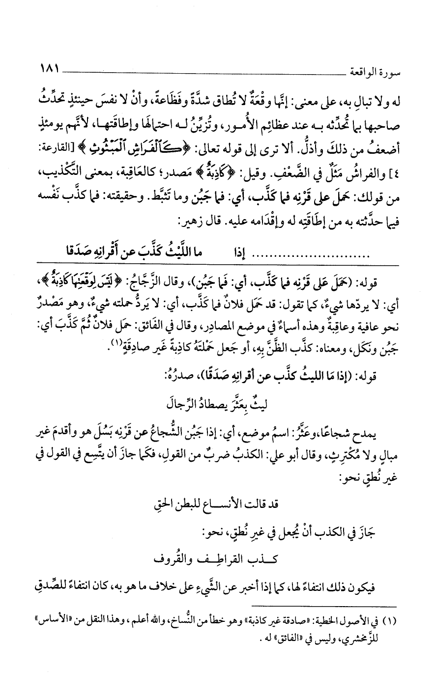 قوله: (حمل على قرنه فما كذب، أي: فما جبن)، وقال الزجاج: {لَيْسَ لِوَقْعَتِهَا كَاذِبَةٌ}، أي: لا يردها شيء، كما تقول: قد حمل فلان فما كذب، أي: لا يرد حملته شيء، وهو مصدر جبن ونكل، ومعناه: كذب الظن به، أو جعل حملته كاذبة غير صادقة.