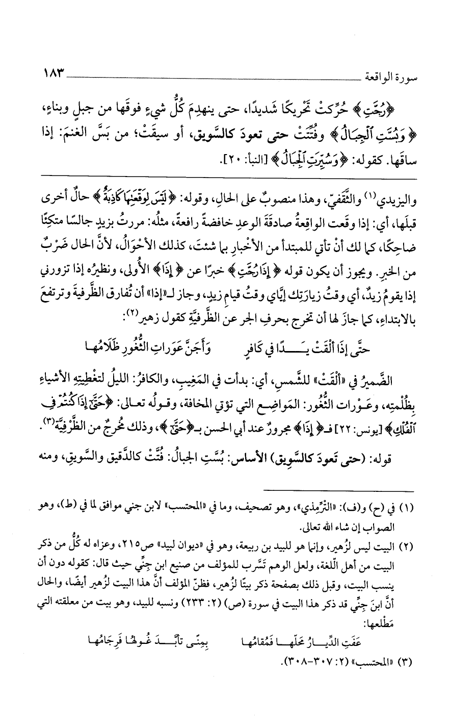 واليزيدي والثقفي، وهذا منصوب على الحال، وقوله: {لَيْسَ لِوَقْعَتِهَا كَاذِبَةٌ} حال أخرى قبلها، أي: إذا وقعت الواقعة صادقة الوعد خافضة رافعة، مثله: مررت بزيد جالسًا متكئًا ضاحكًا، كما لك أن تأتي للمبتدأ من الأخبار بما شئت، كذلك الأحوال، لأن الحال ضرب من الخبر. ويجوز أن يكون قوله {إذَا رُجَّتِ} خبرًا عن {إذَا} الأولى، ونظيره إذا تزورني إذا يقوم زيد، أي وقت زيارتك إياي وقت قيام زيد، وجاز لـ"إذا" أن تفارق الظرفية وترتفع بالابتداء، كما جاز لها أن تخرج بحرف الجر عن الظرفية كقول زهير: