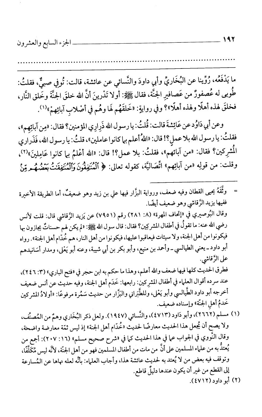 ما يدفعه، روينا عن البخاري وأبي داود والنسائي عن عائشة، قالت: توفي صبي، فقلت: طوبى له عصفور من عصافير الجنة، فقال صلى الله عليه وسلم: أولا تدرين أن الله خلق الجنة وخلق النار، فخلق لهذه أهلًا ولهذه أهلًا"؟ وفي رواية: "خلقهم لها وهم في أصلاب أبائهم".