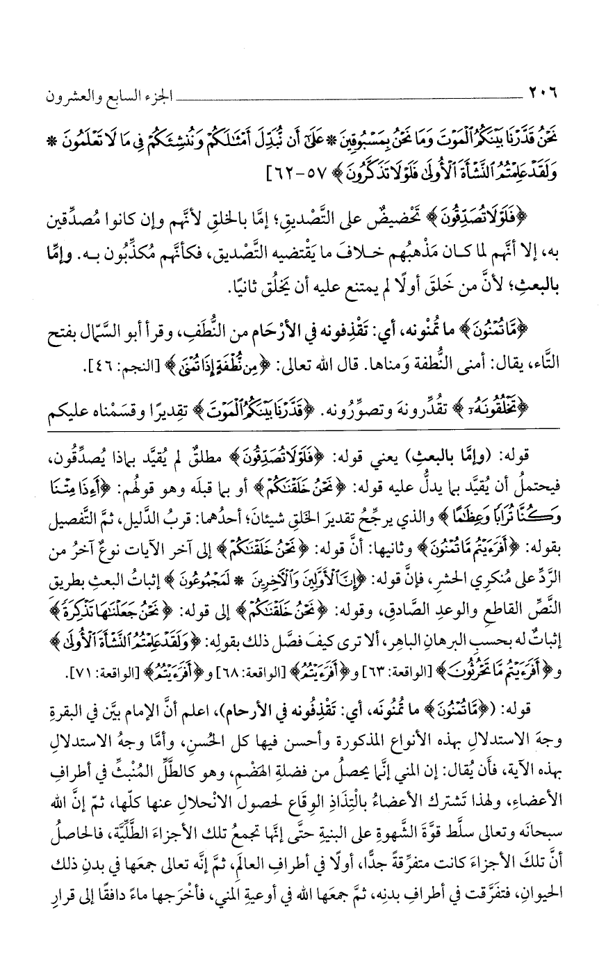 قوله: {مَّا تُمْنُونَ} ما تمنونه، أي: تقذفونه في الأرحام)، اعلم أن الإمام بين في البقرة وجه الاستدلال بهذه الأنواع المذكورة وأحسن فيها كل الحسن، وأما وجه الاستدلال بهذه الآية، فأن يقال: إن المني إنما يحصل من فضله الهضم، وهو كالطل المنبث في أطراف الأعضاء، ولهذا تشترك الأعضاء بالتذاذ الوقاع لحصول الانحلال عنها كلها، ثم إن الله سبحانه وتعالى سلط قوة الشهوة على البنية حتى إنها تجمع تلك الأجزاء الطلية، فالحاصل أن تلك الأجزاء كانت متفرقة جدًا، أولًا في أطراف العالم، ثم إنه تعالى جمعها في بدن ذلك الحيوان، فتفرقت في أطراف بدنه، ثم جمعها الله في أوعية المني، فأخرجها ماءً دافقًا إلى قرار